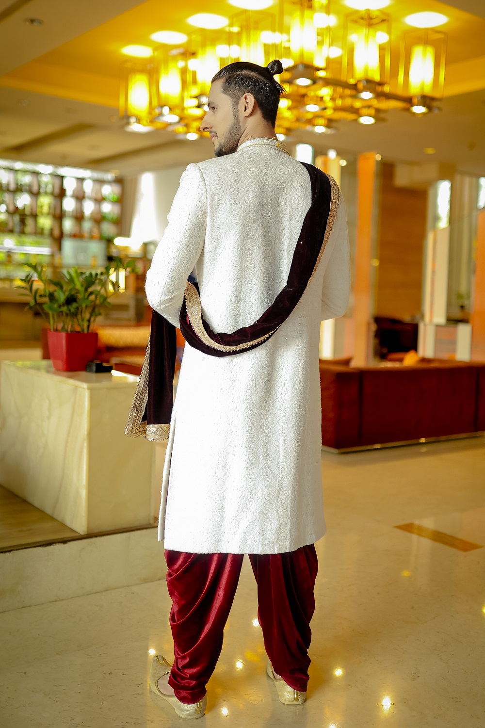Rent this White Sherwani elegantly styled with intricate thread and pearl work, paired with Maroon velvet Peshawari, for a classic charm with a touch of sophistication.