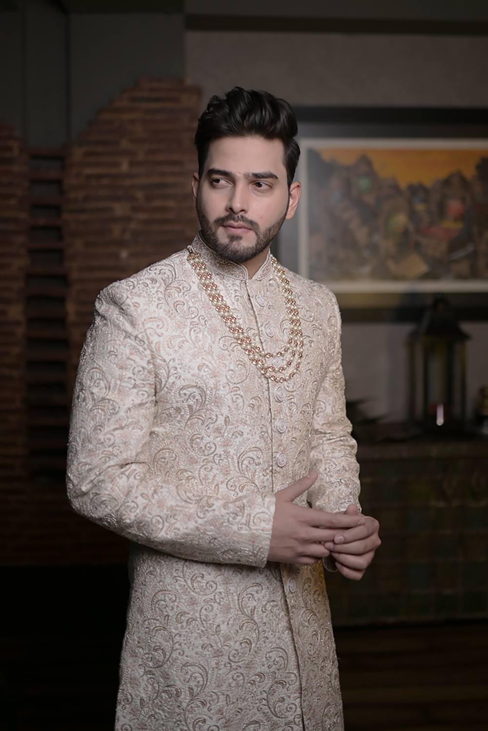 Rent this Cream sherwani with intricate floral embroidery and golden pleated dupatta and matching pajama, for a classic and elegant ensemble.