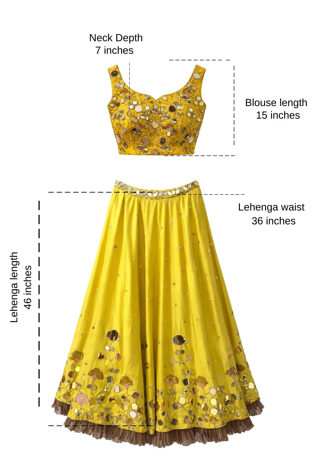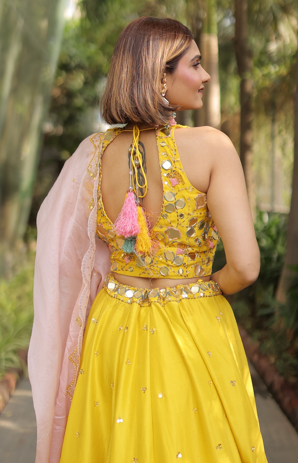 Rent this vibrant yellow designer lehenga set, featuring striking chunky mirror work and a contrasting pink dupatta for a bold and festive look.