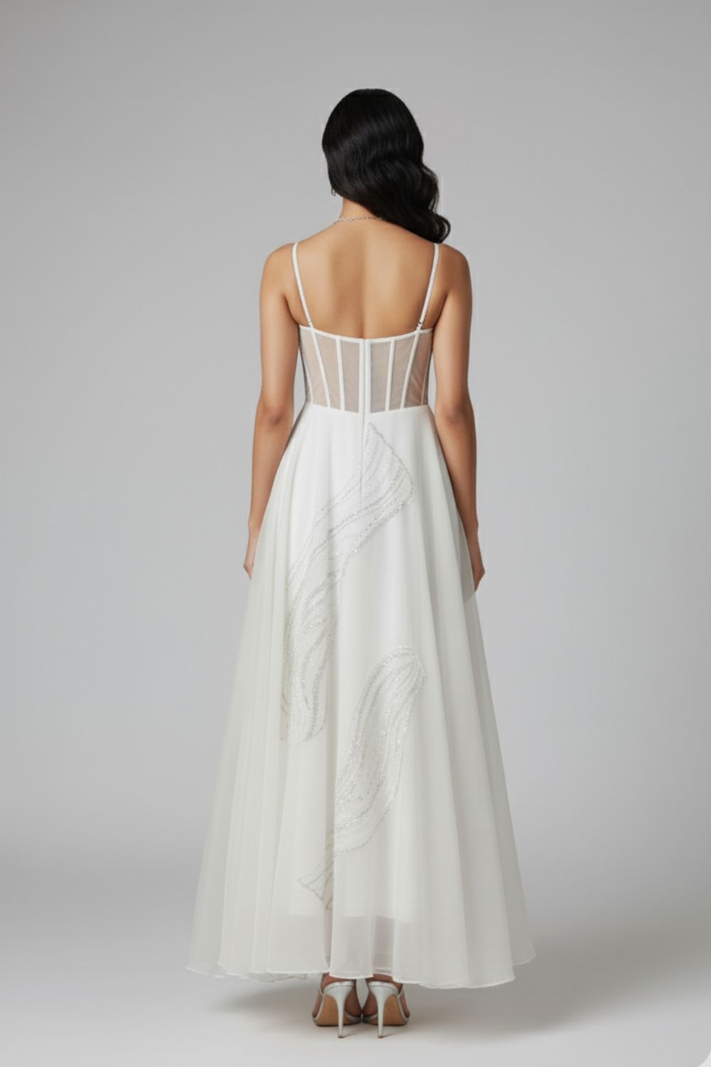 Rent this white corset gown with frills and transparent net detailing on top, offering a captivating blend of allure and elegance.