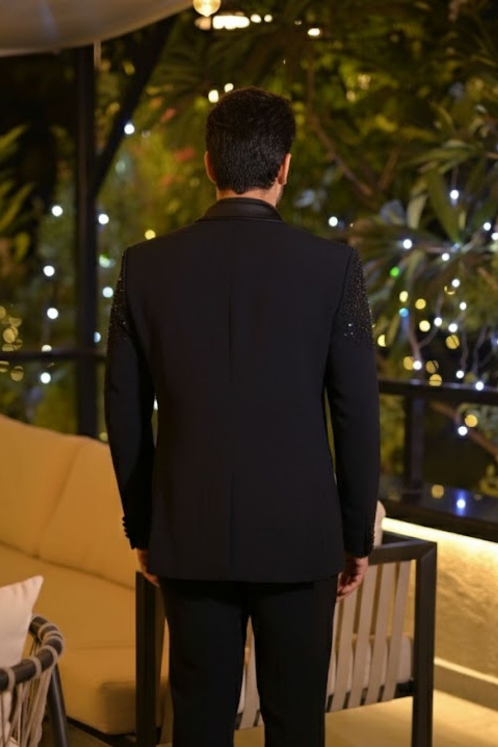 Rent this unique blue tuxedo with an artful beaded shoulder design, offering a chic and elevated take on formal wear.