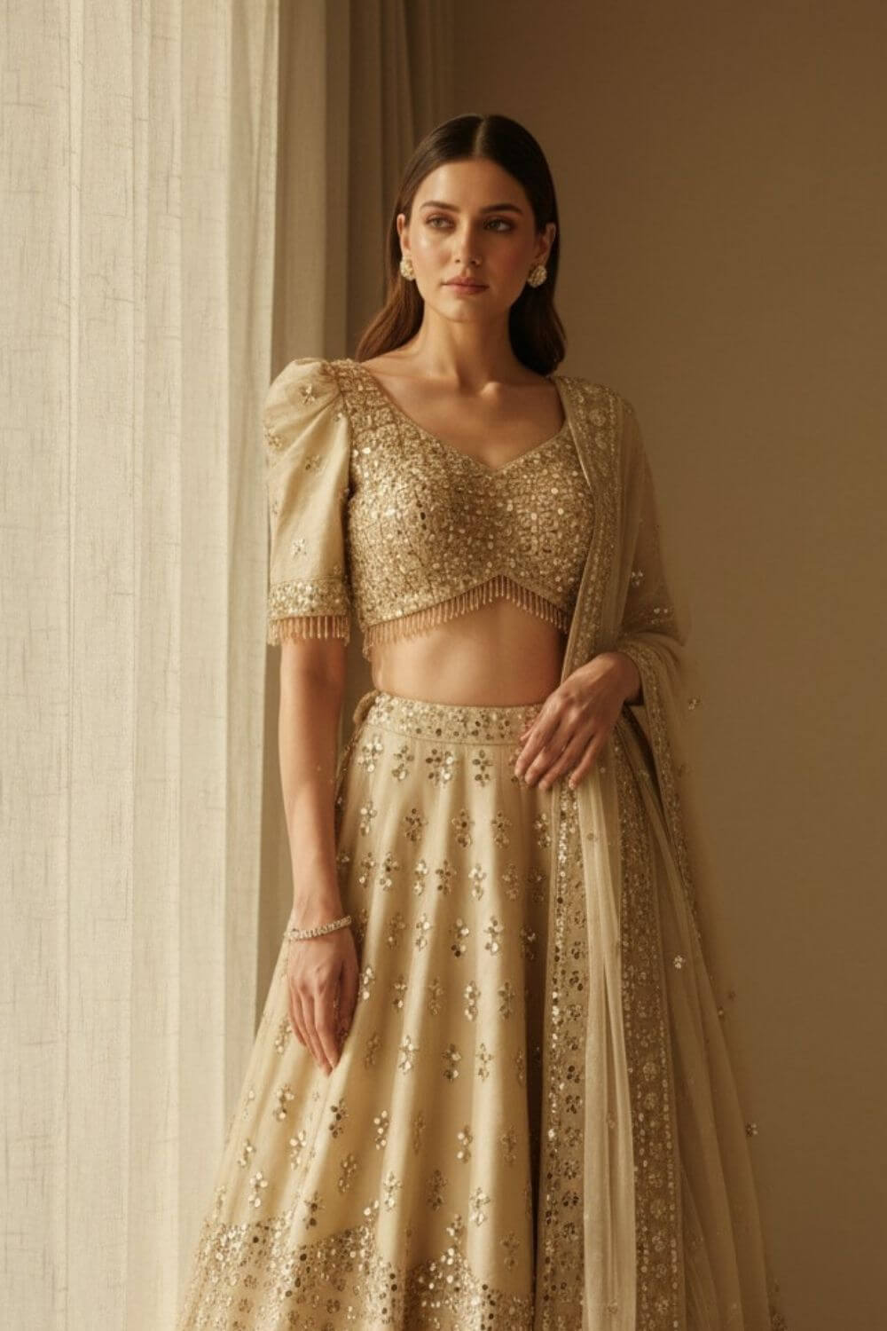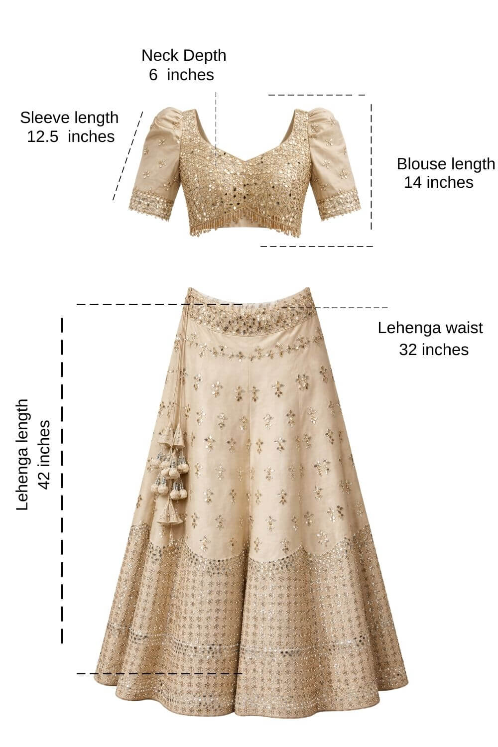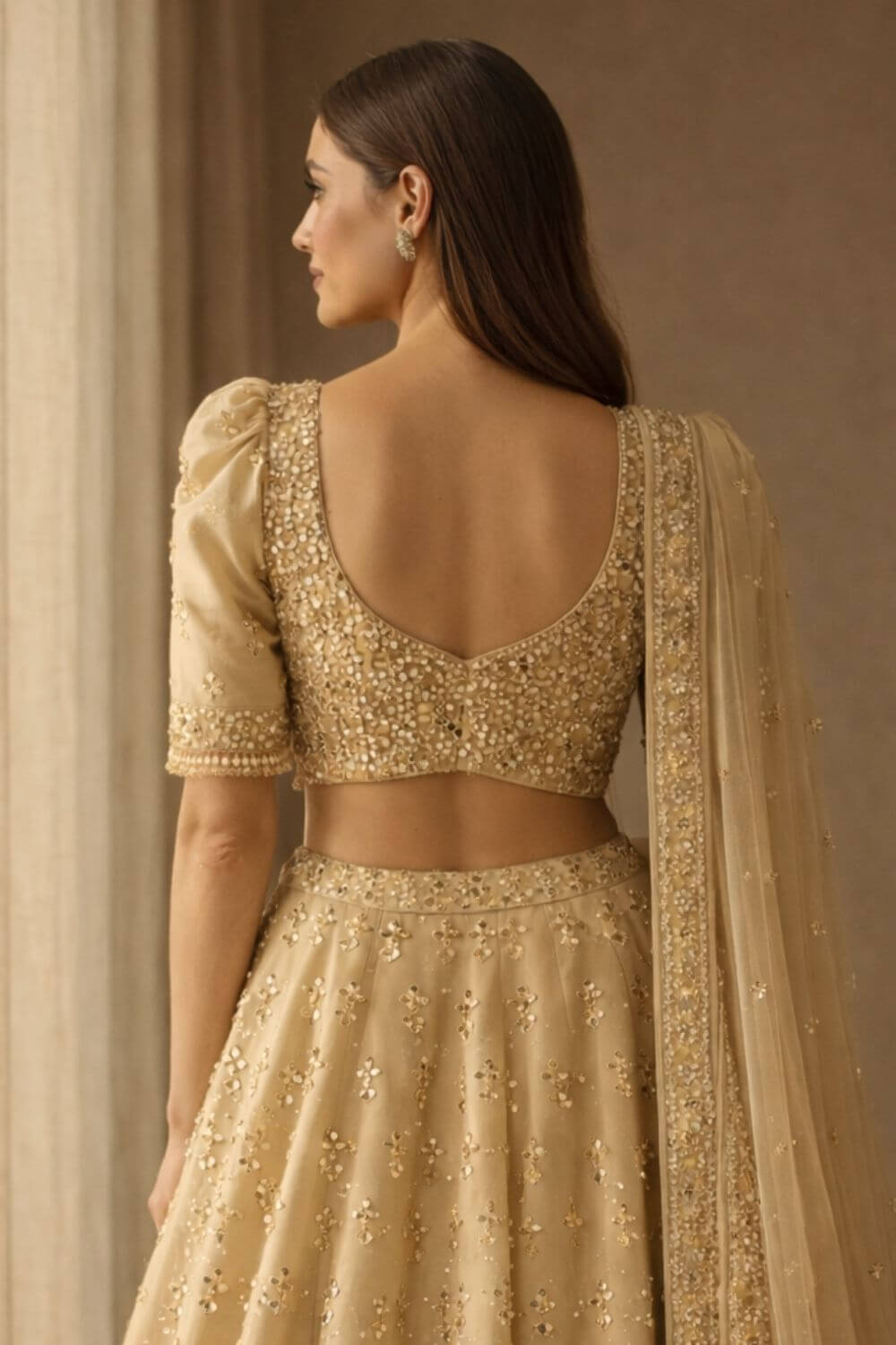 Rent this beige mirrorwork lehenga set with a puffed-sleeve blouse for a chic, standout look.