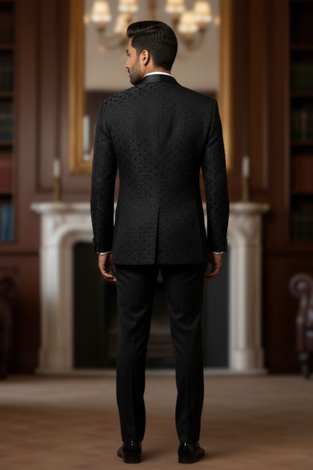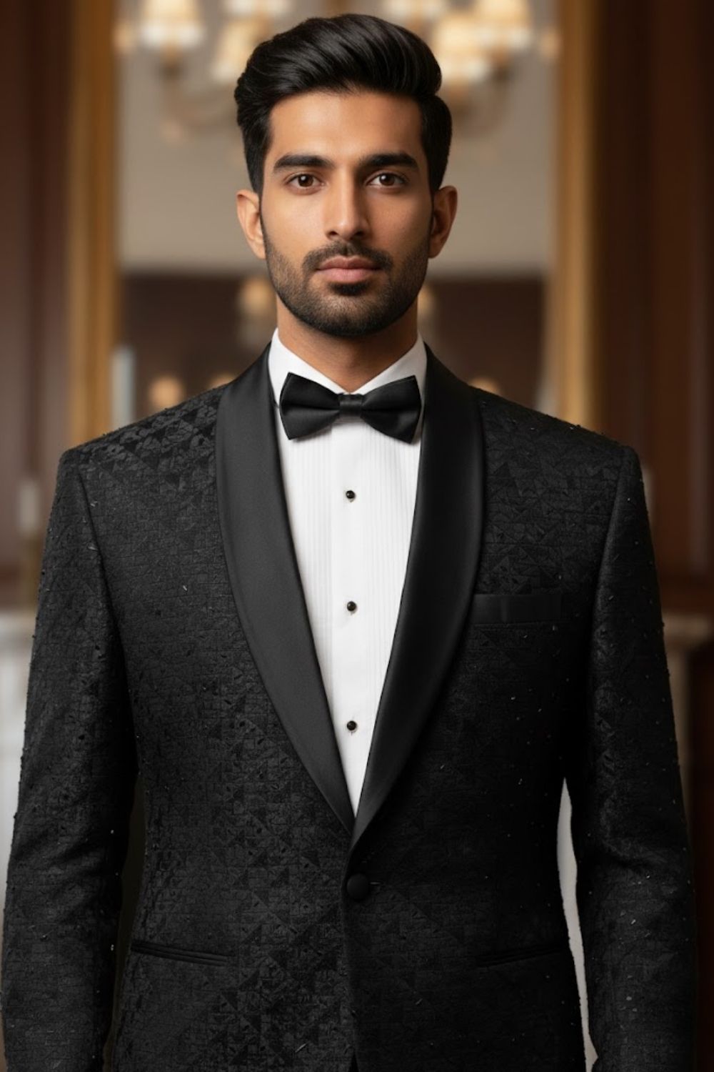Rent this sleek black tuxedo with a subtle textured pattern and matching vest, for a refined evening look.