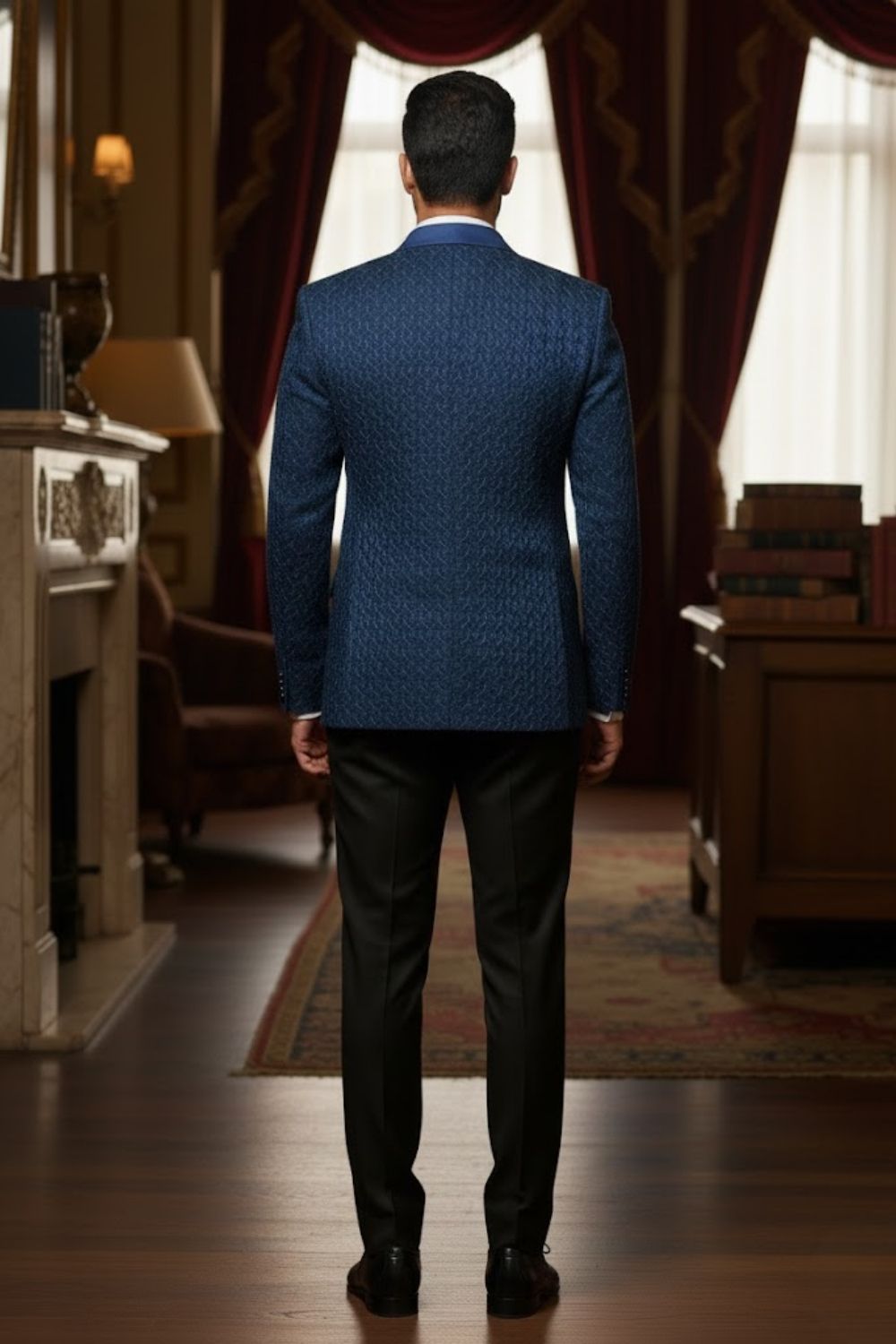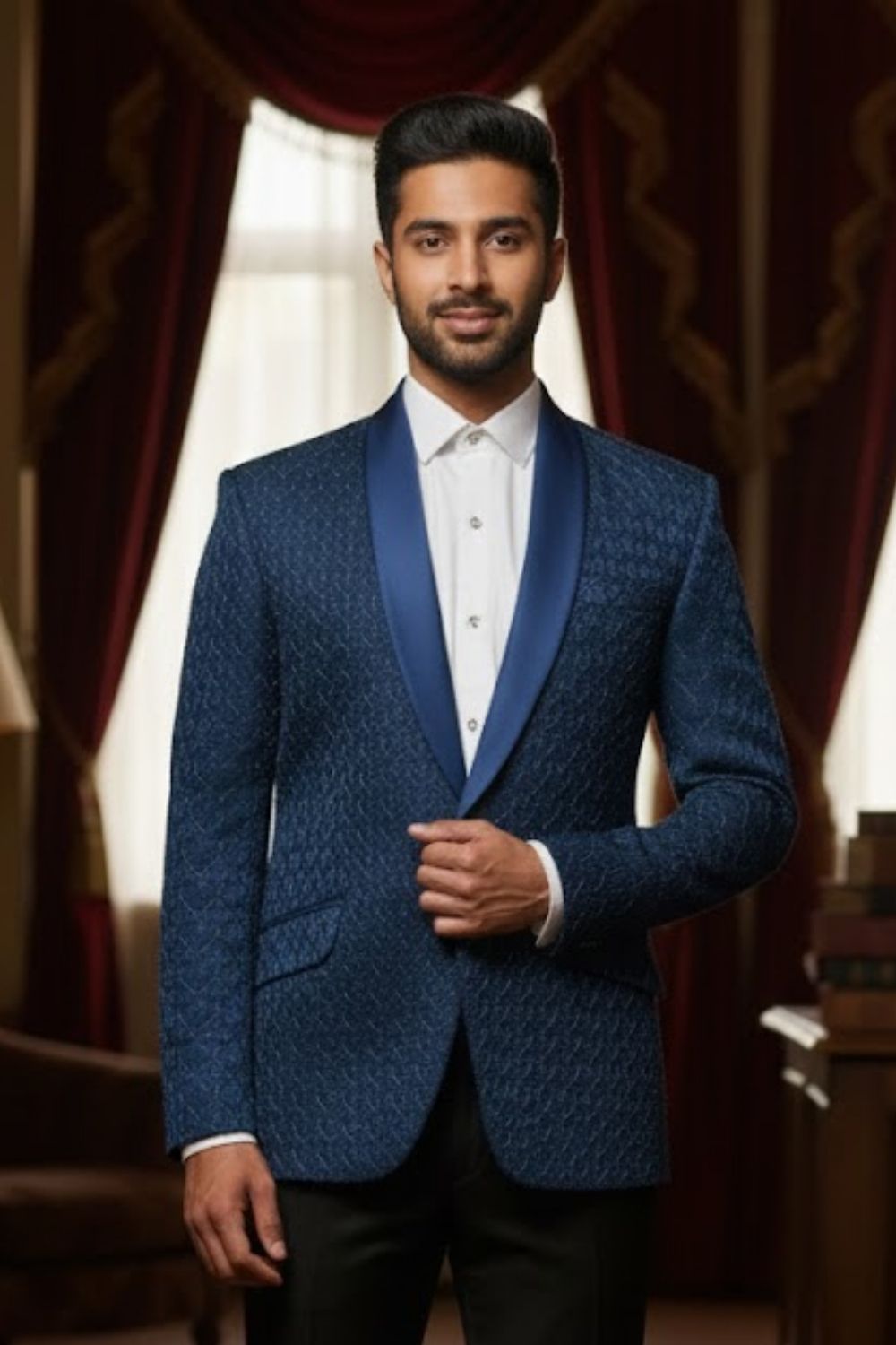 Rent this modern navy blue blazer in a structured suiting fabric, embellished with subtle self-design embroidery and a bold, deep-blue satin shawl lapel.