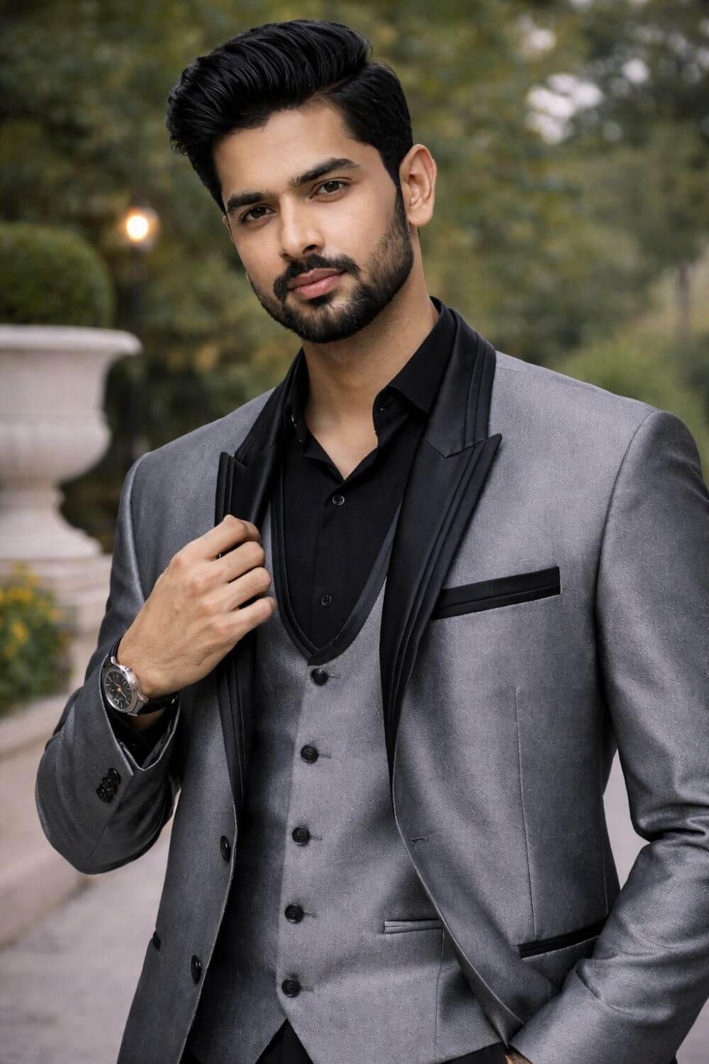 Grey suit with black lapel