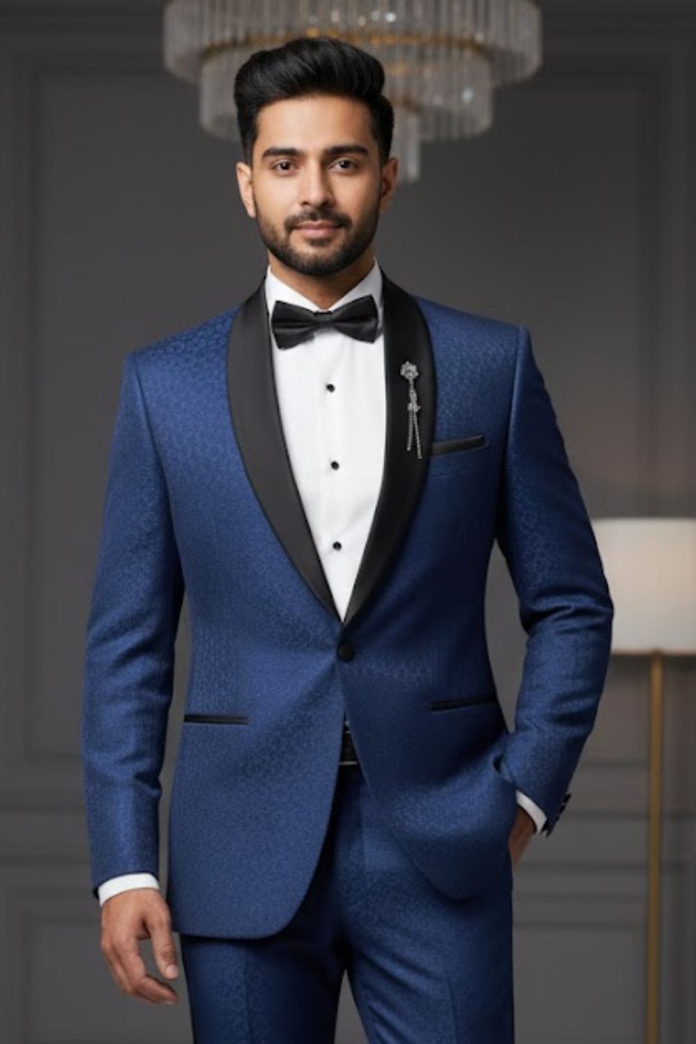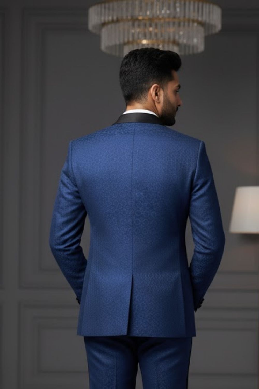 Rent this sharp blue tuxedo, crafted from premium jacquard fabric, distinguished by a self-textured design and contrasting black satin lapels.