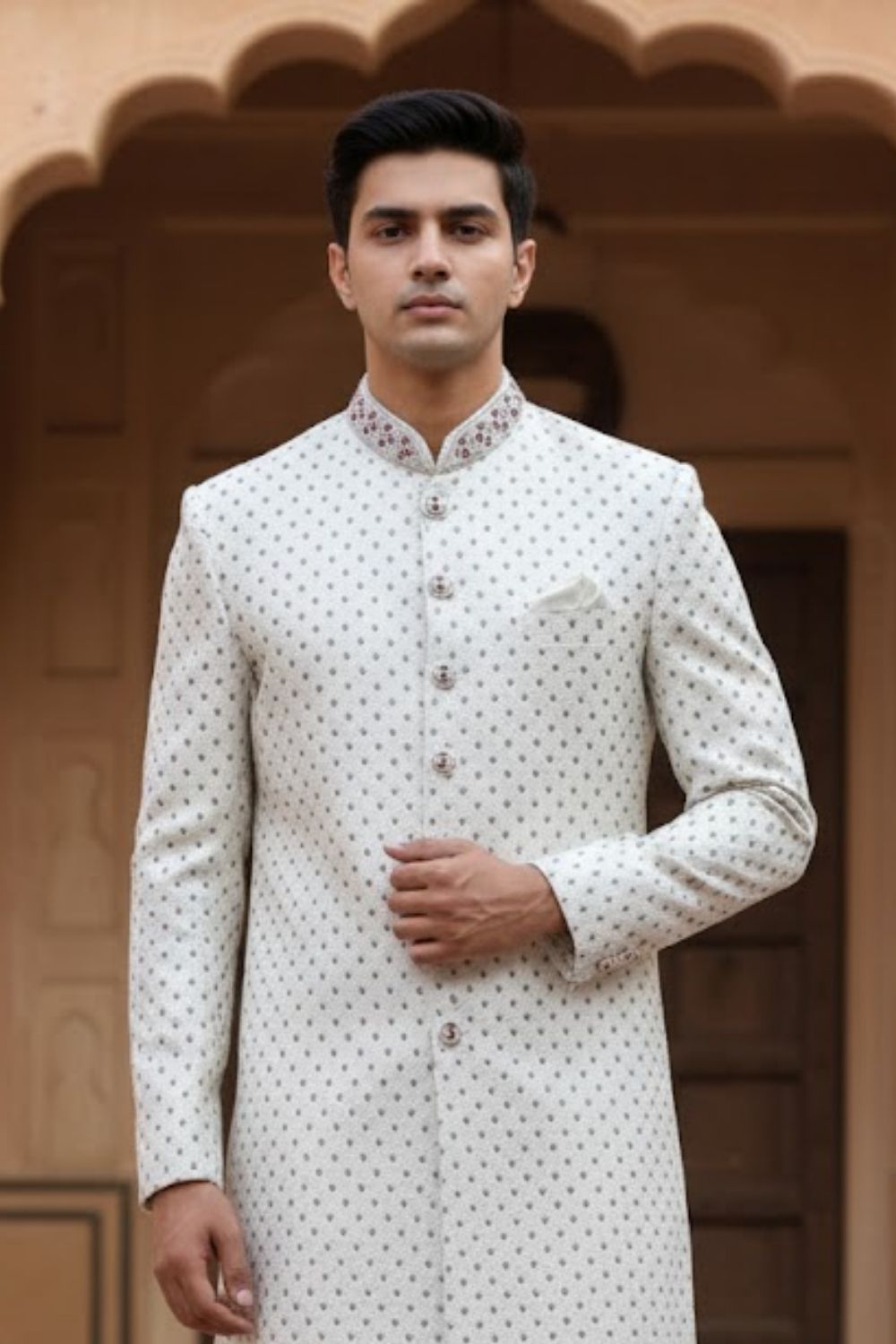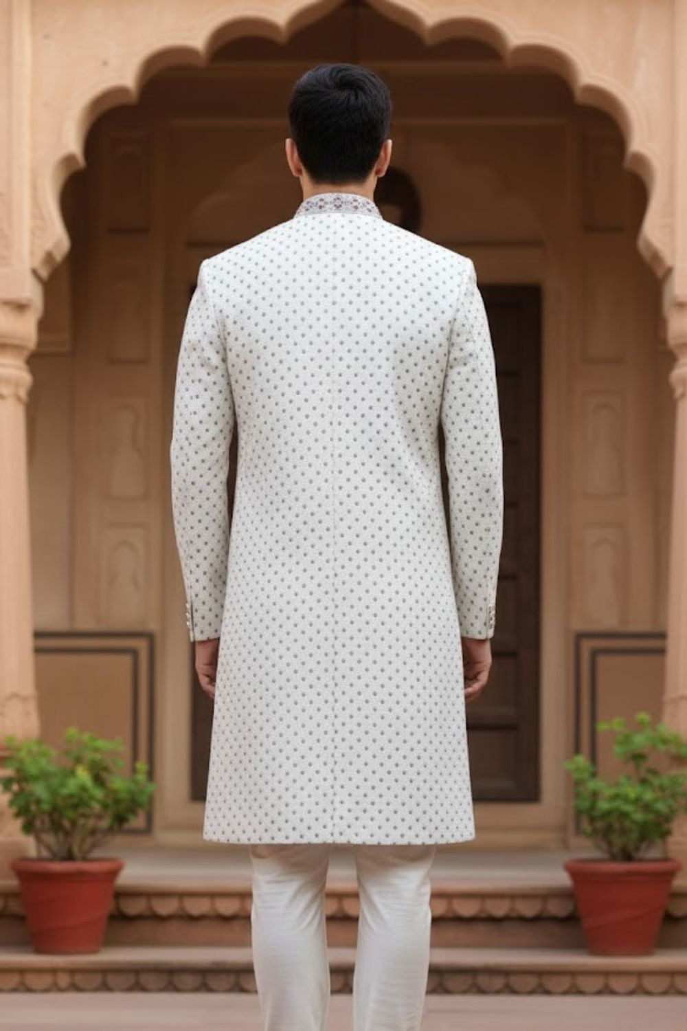 Rent this pristine white sherwani made with a rich self-textured fabric, showcasing a minimalist design with embroidered detailing and a contrasting embroidered collar.