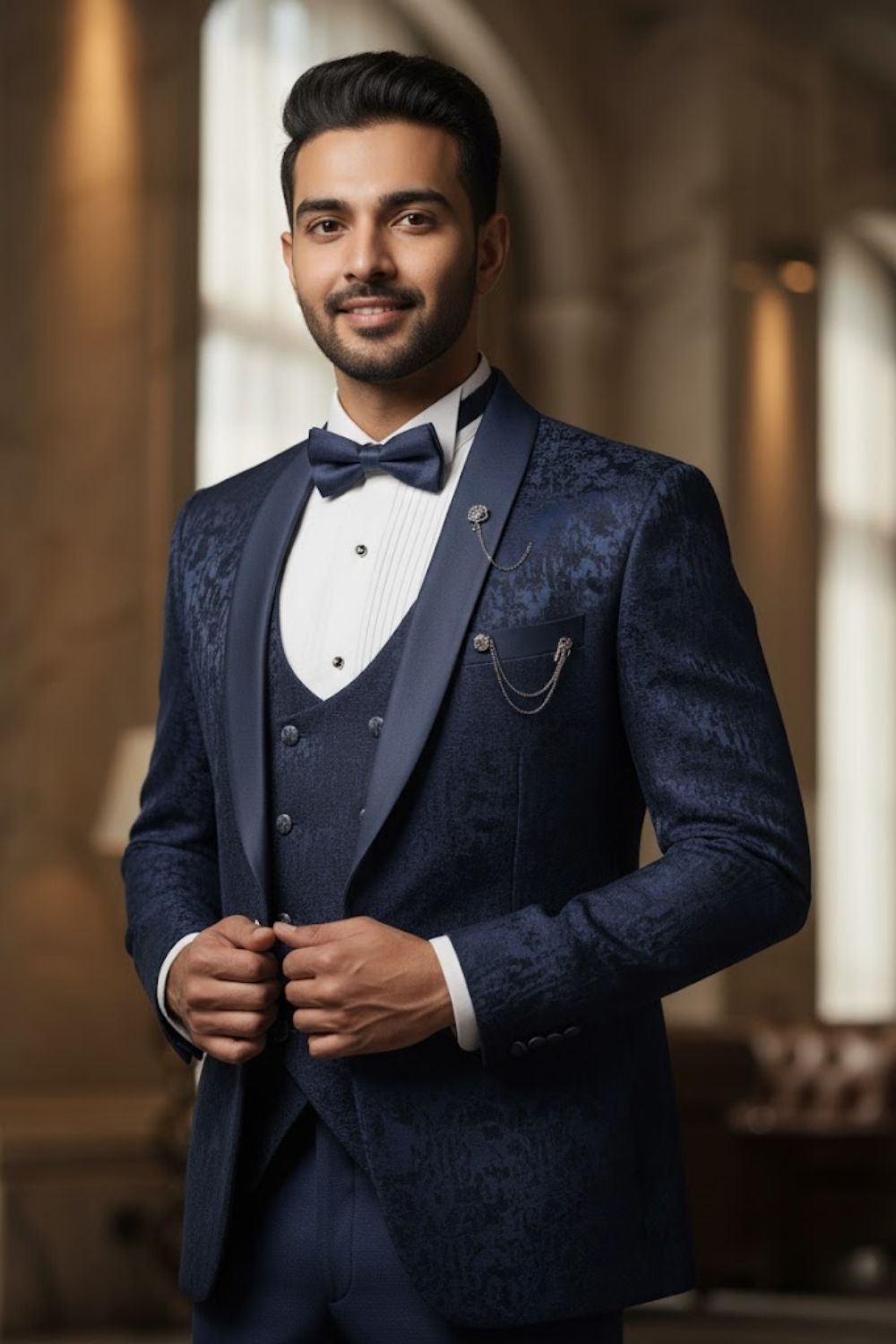 Rent this elegant navy blue three-piece suit in a textured fabric, showcasing a beautiful self-woven floral texture and clean, plain shawl collars.