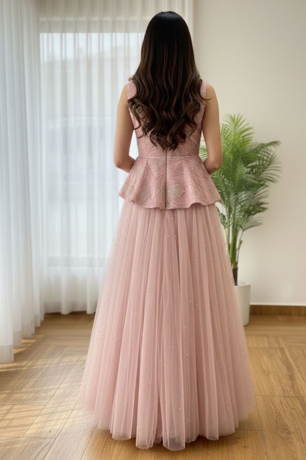 Rent this statement blush pink layered net gown, combining a fitted asymmetric peplum top and a flowing skirt, adorned with sparkling silver sequin detailing.