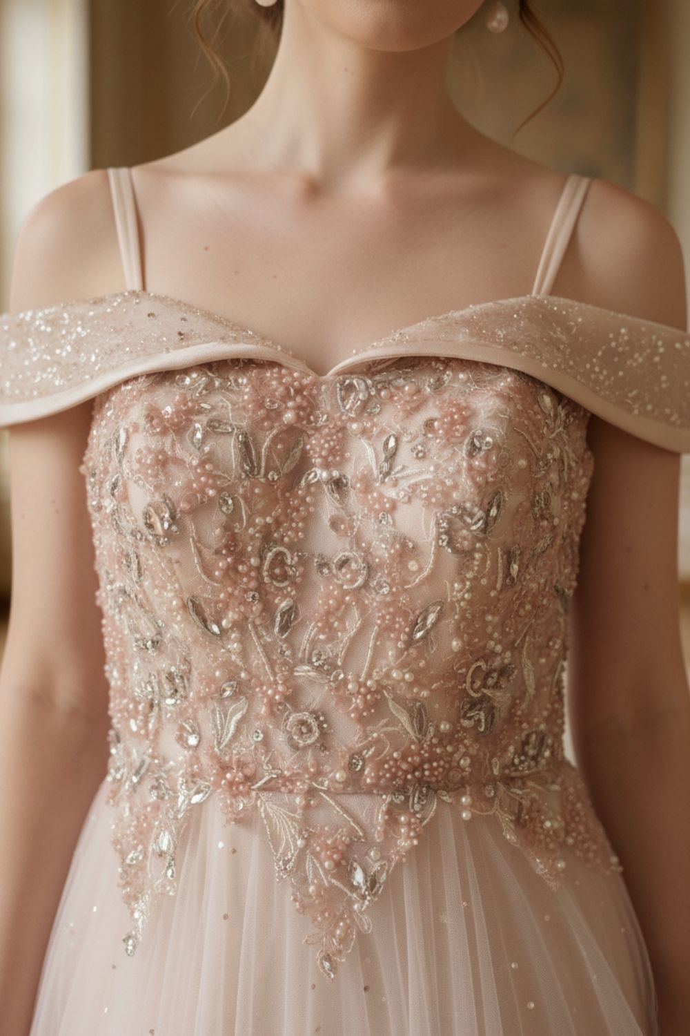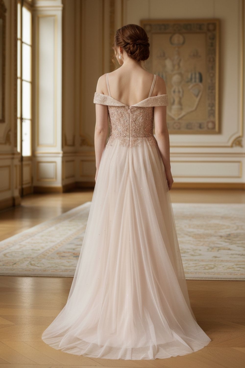 Rent this delicate white tulle off-shoulder gown featuring an elegant draped neckline and exquisite floral thread and bead work on the bodice.