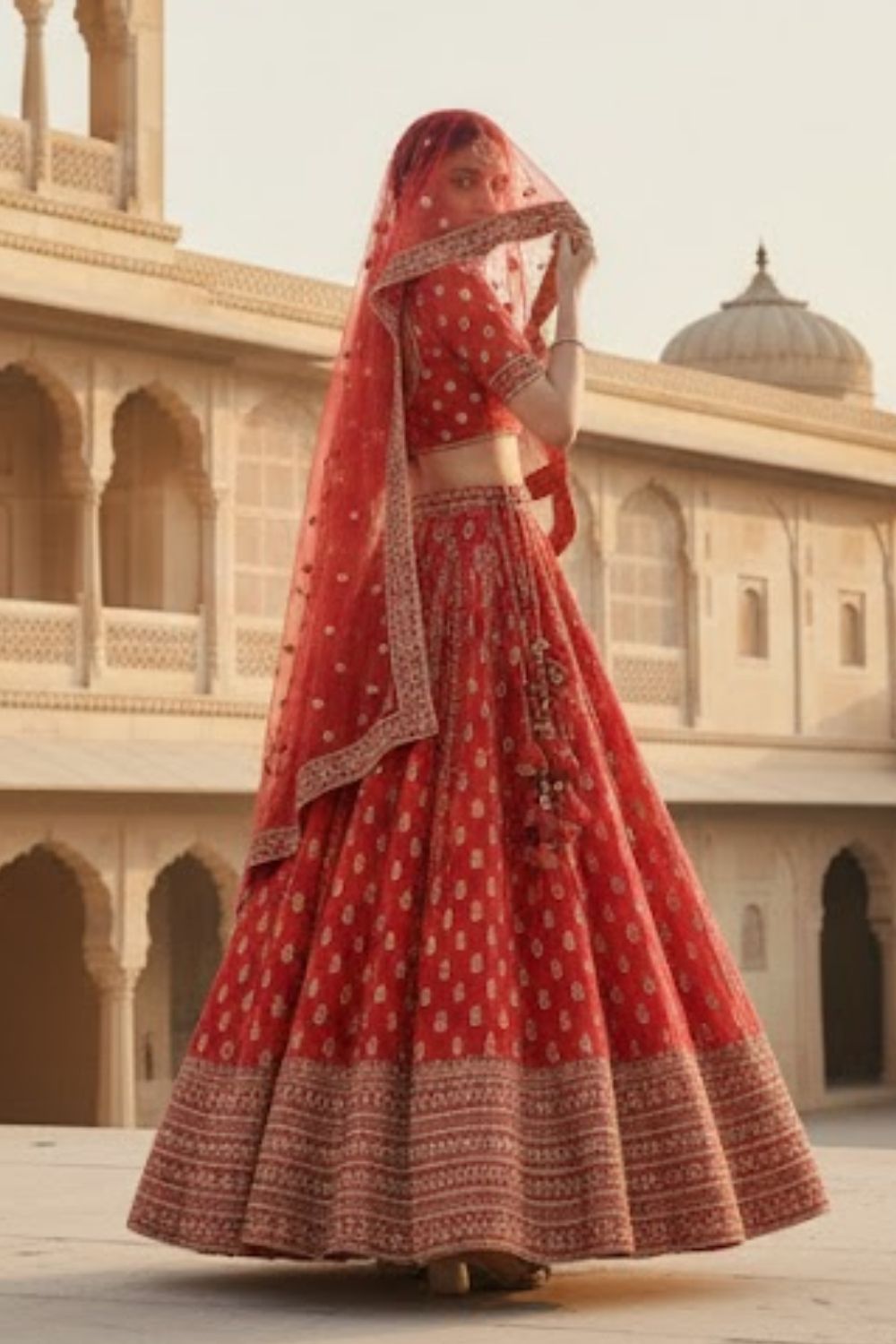 Rent this vibrant red raw silk lehenga adorned with intricate gold embroidery and detailed borders. Features side-zip blouse and adjustable drawstring waist, perfect for weddings and festivities.
