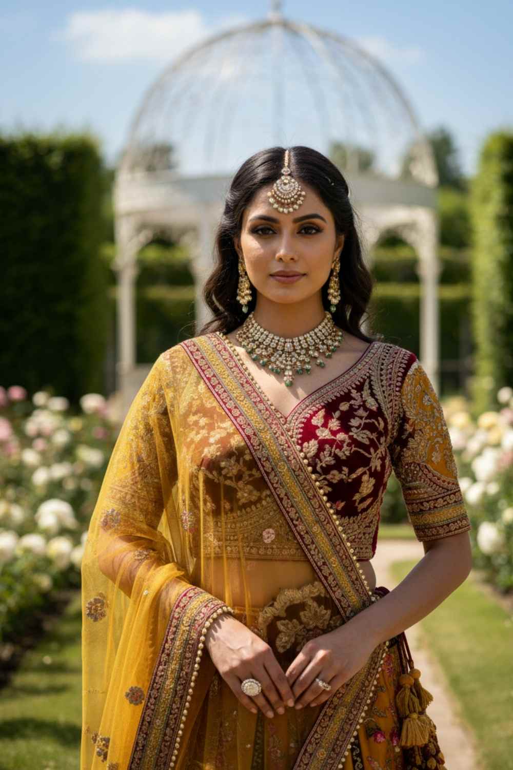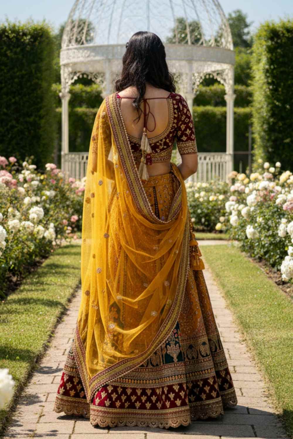 Rent this vibrant multi color bridal lehenga crafted in raw silk and velvet, adorned with rich thread and zari work, complete with blouse and double dupatta.