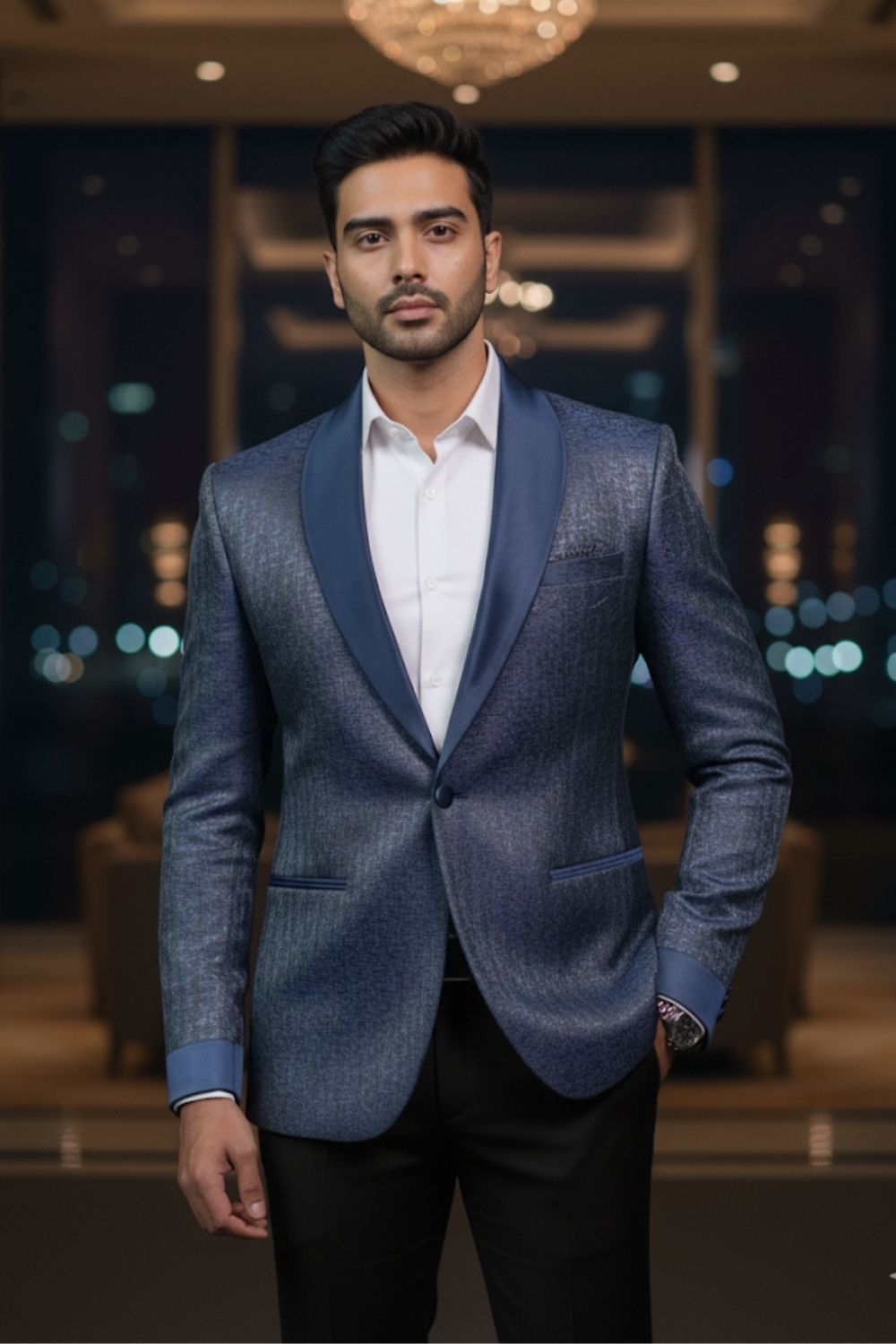 Rent this tailored blue tuxedo with a bold textured pattern, over it a blue satin lapel, for a standout evening ensemble.