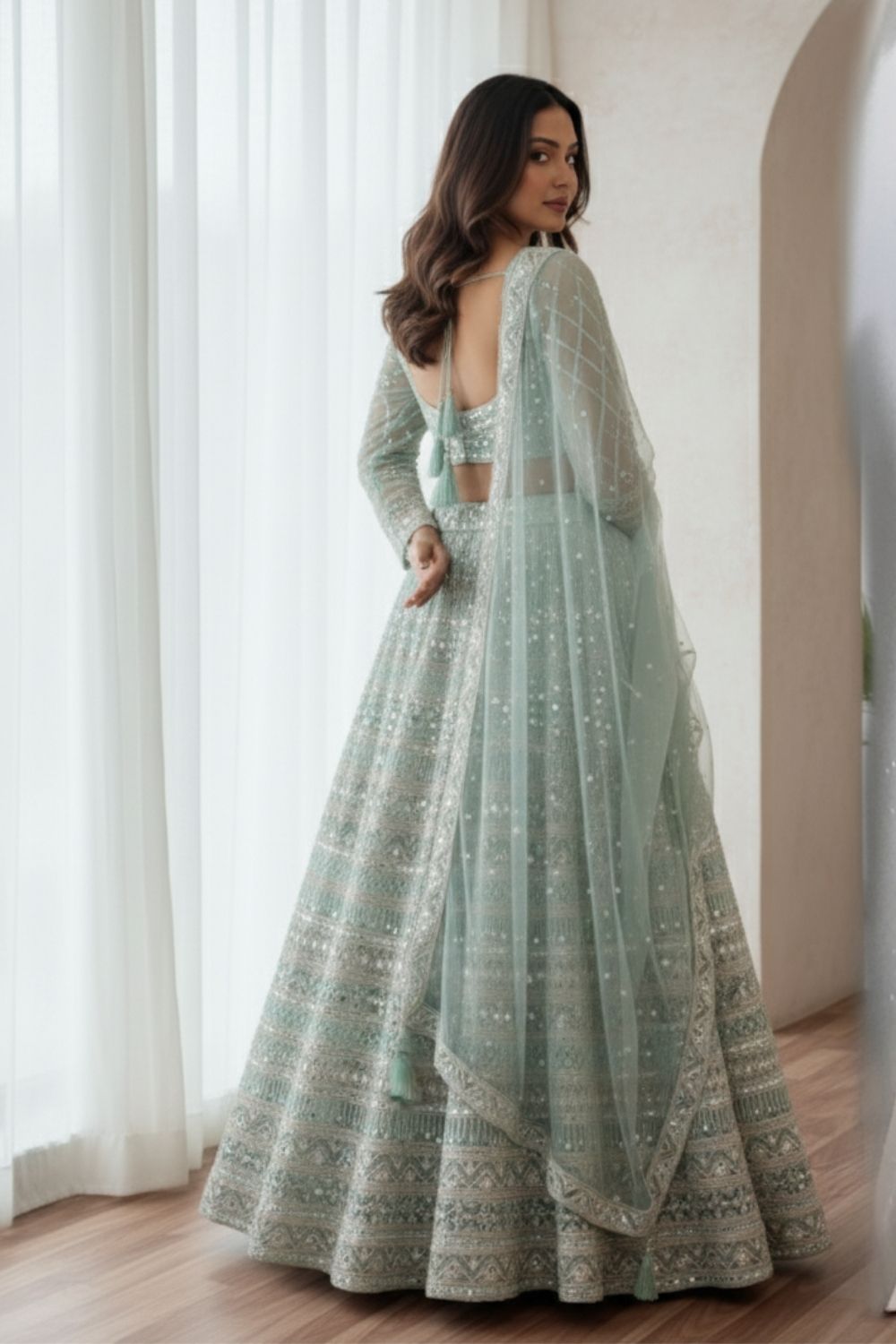 Rent this breathtaking sea green lehenga set crafted from net fabric, featuring heavy mirror work, intricate white thread, and silver sequin embroidery, complete with a embroidered cuff blouse and a coordinated sheer net dupatta.