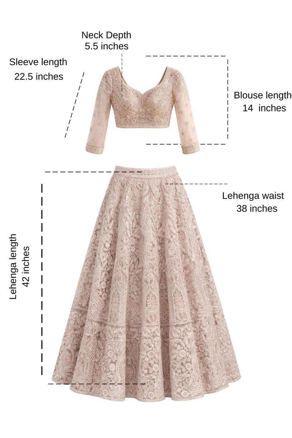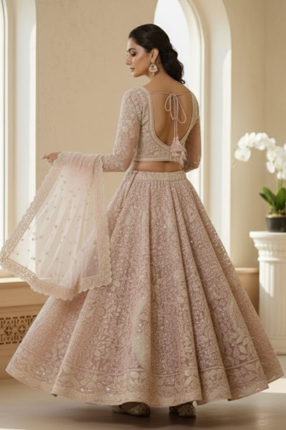 Rent this exquisite nude beige lehenga with a net overlay, adorned with dense floral thread embroidery and shimmering silver detailing styled with blouse and a dupatta.