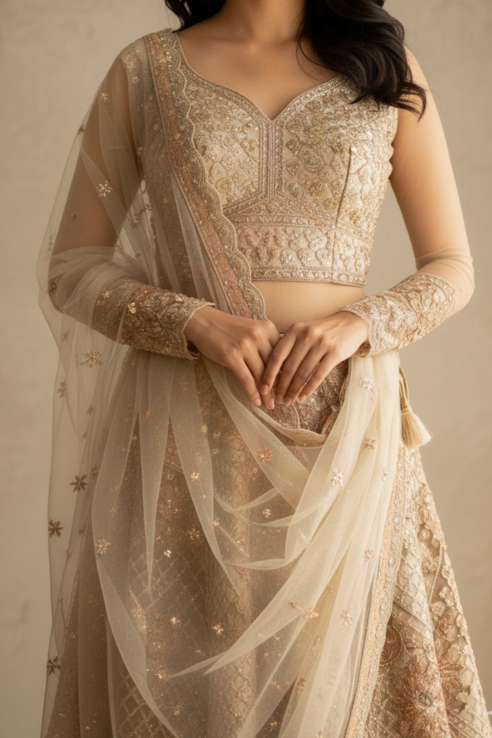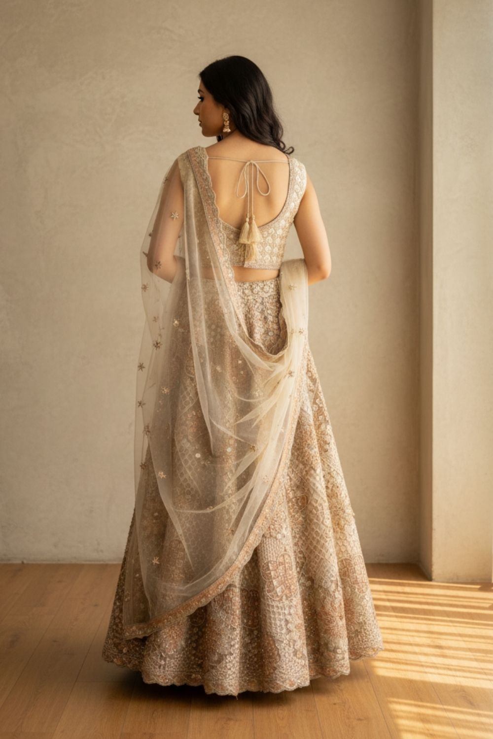 Rent this stunning nude brown lehenga set crafted from fine net fabric, featuring intricate heavy multi-tone thread, sequin, and bead work, complete with a embroidered blouse and a coordinated sheer net dupatta with tassels.