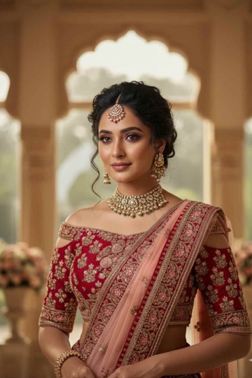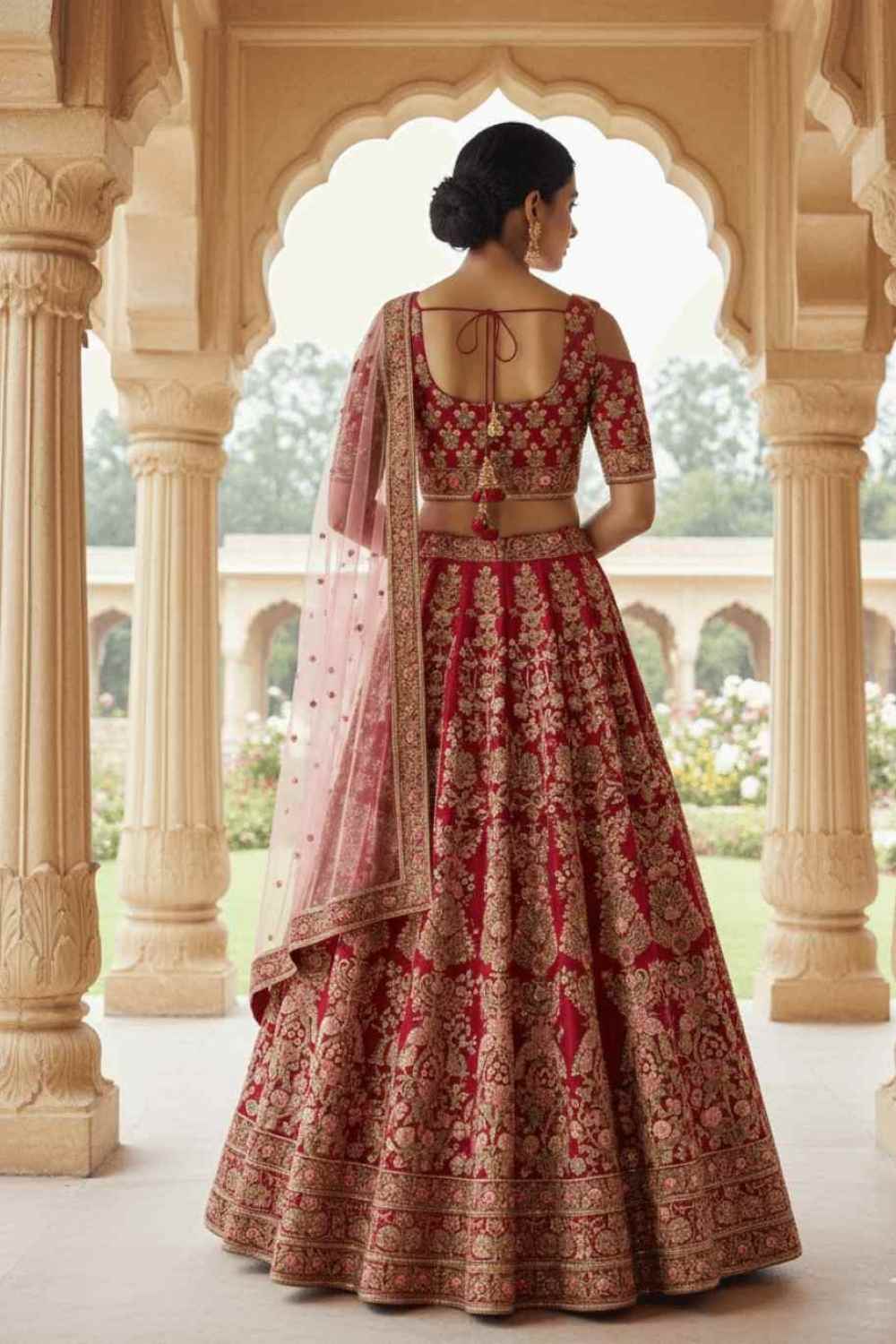 Rent this luxurious Red raw silk bridal lehenga adorned with intricate zari and resham embroidery, styled with a cold-shoulder blouse and single net dupatta.