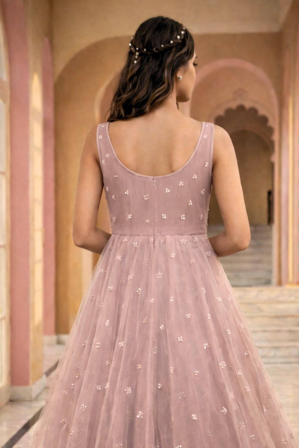 Rent this stunning lilac gown crafted from sheer net fabric, featuring a fully beaded and sequined bodice with a flattering V-neck, and a voluminous skirt with scattered silver embellishments.