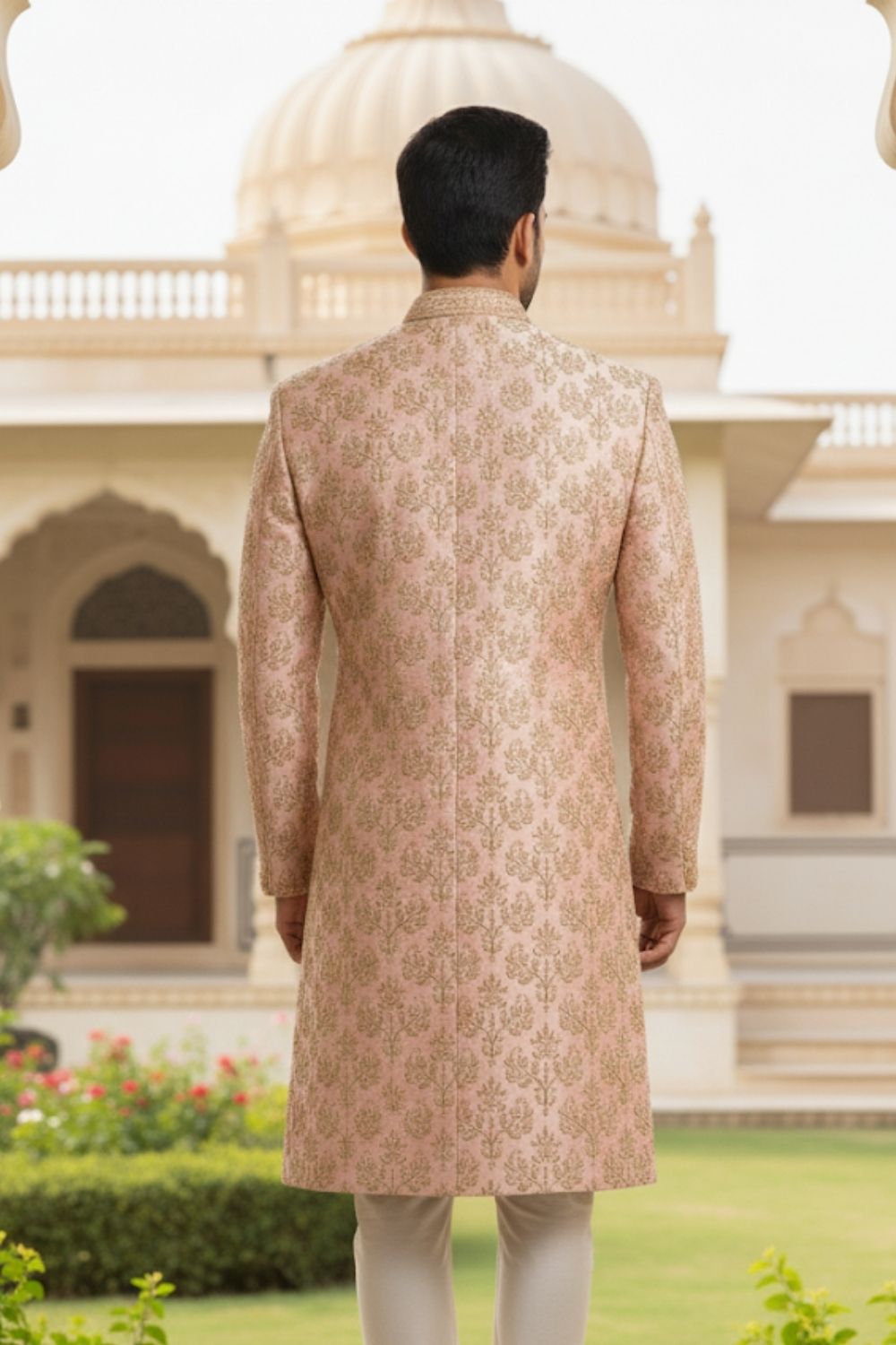 Rent this stunning white and beige Sherwani, featuring intricate all-over gold Zari and thread embroidery in a dense floral pattern for a grand wedding look.