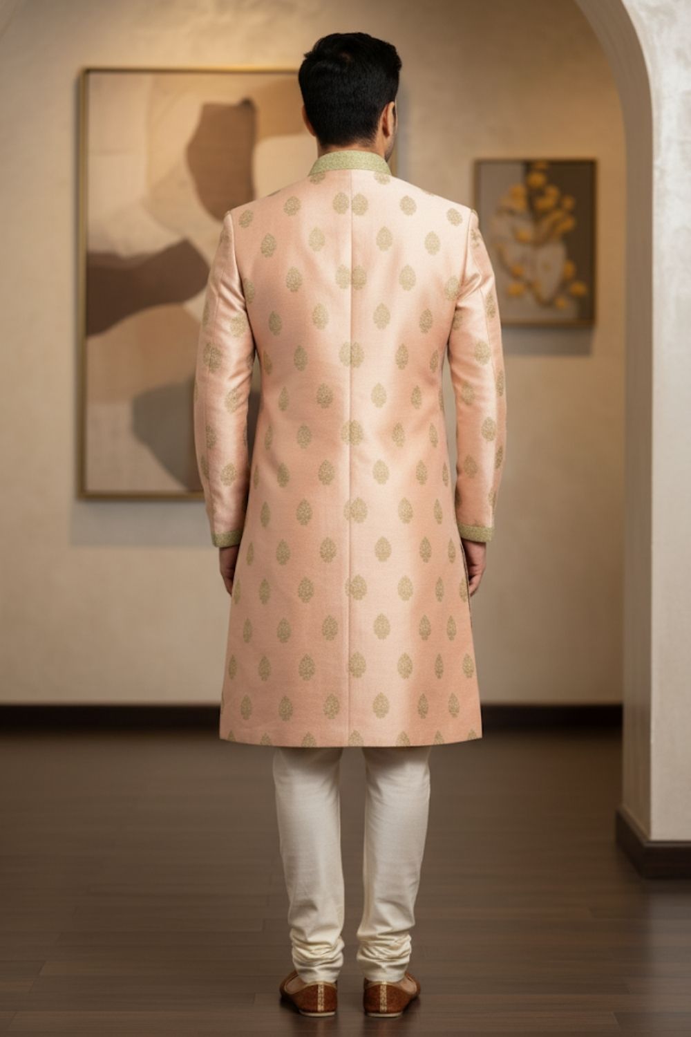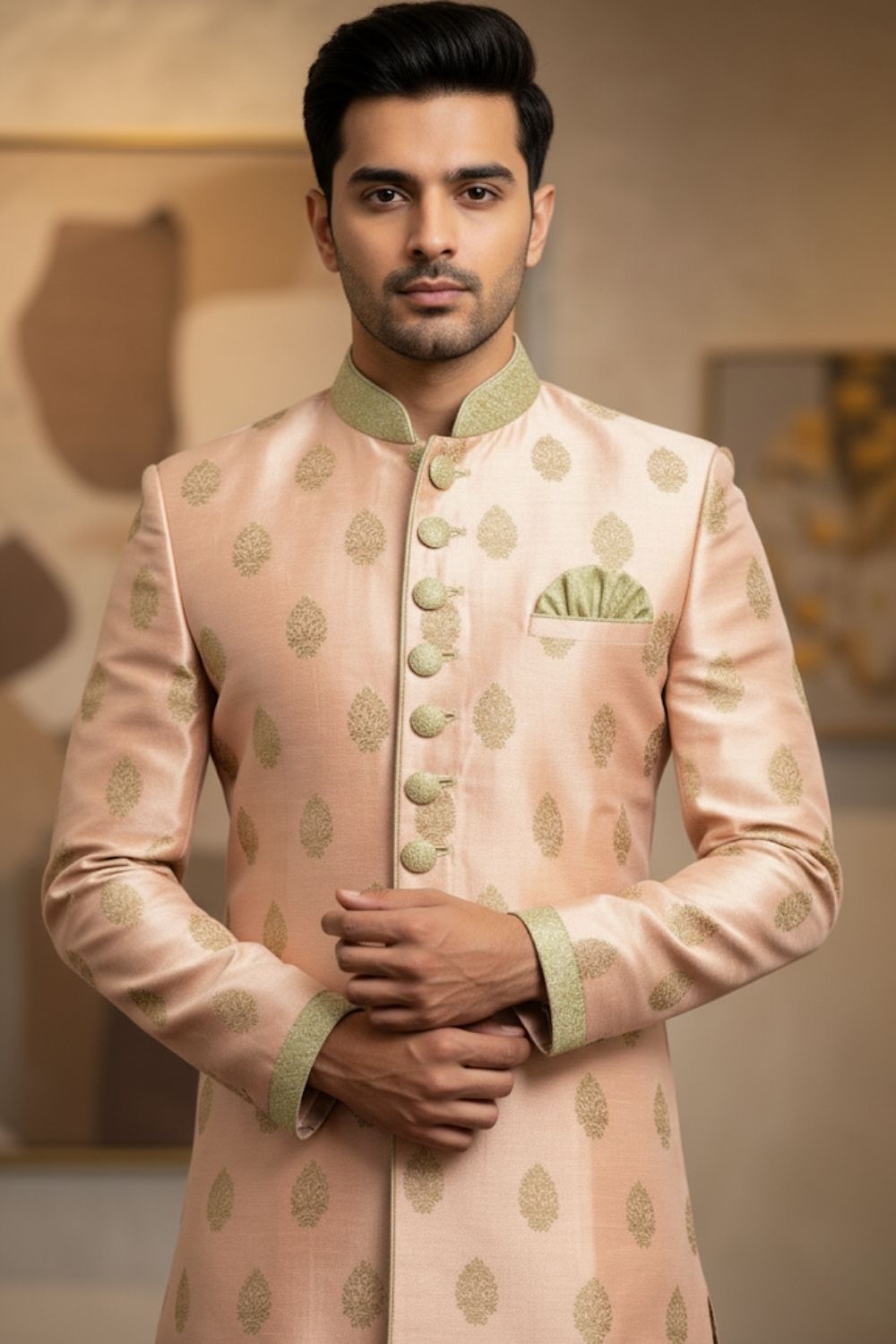 Rent this refined Light Pink sherwani, featuring all-over gold woven motifs and delicate contrast light green piping/work for a sophisticated wedding look.