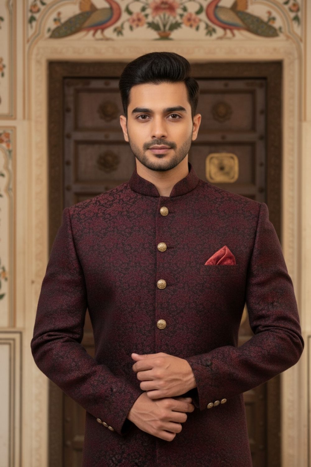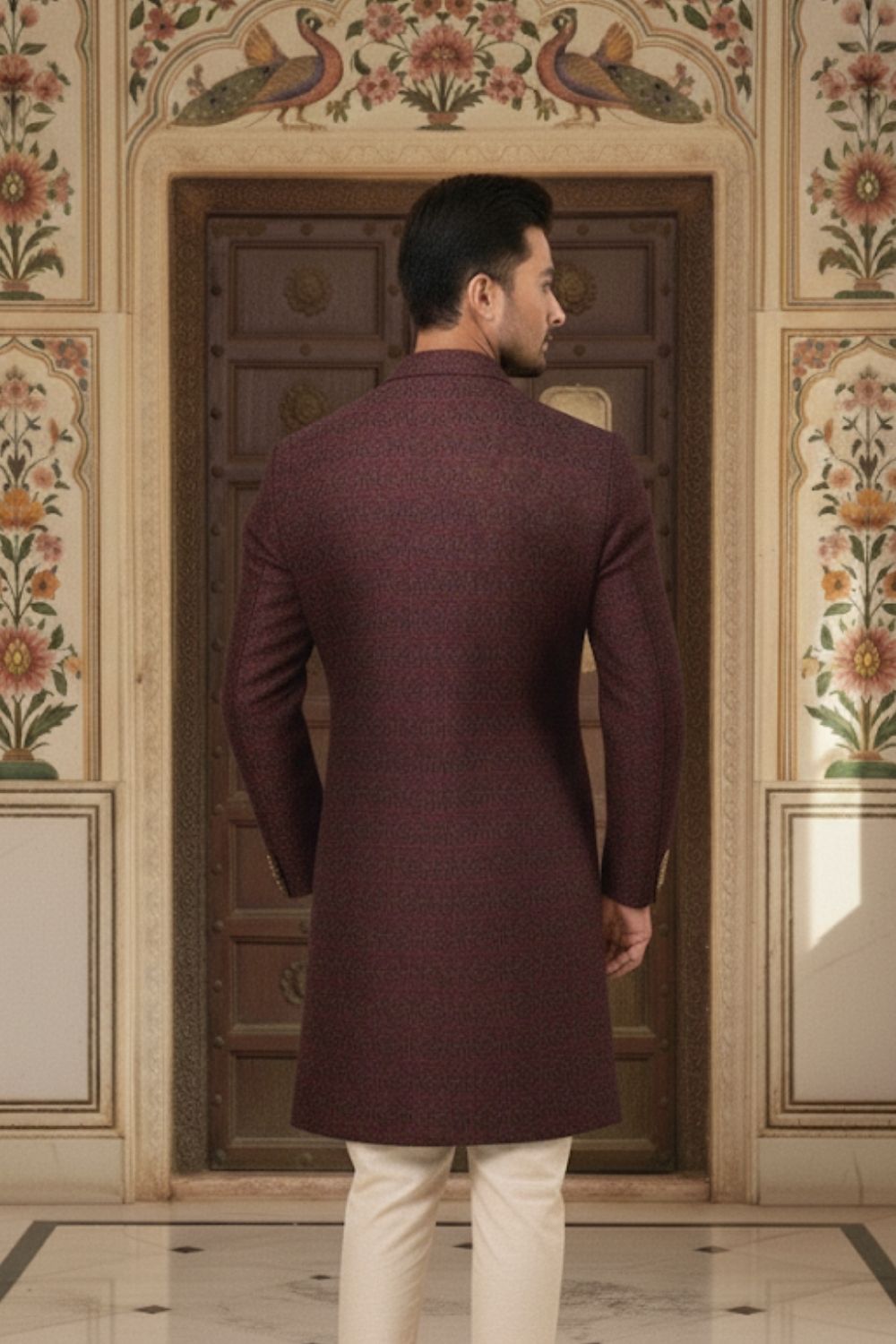 Rent this elegant maroon and black textured sherwani, featuring a subtle all-over floral woven pattern and striking gold-tone buttons for a sophisticated festive look.
