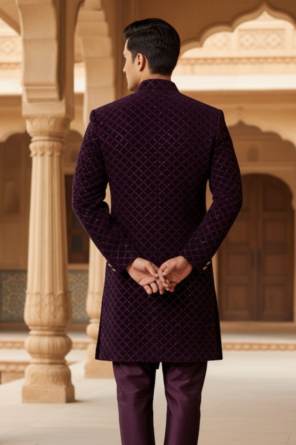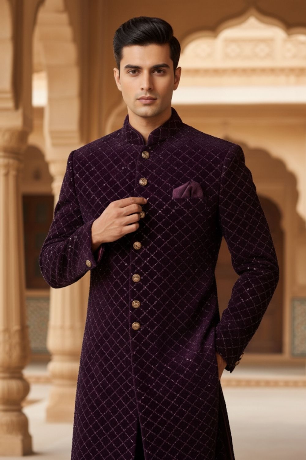 Rent this magnificent purple velvet sherwani, featuring golden buttons intricate all-over sequin and bead work in a striking diamond trellis pattern.