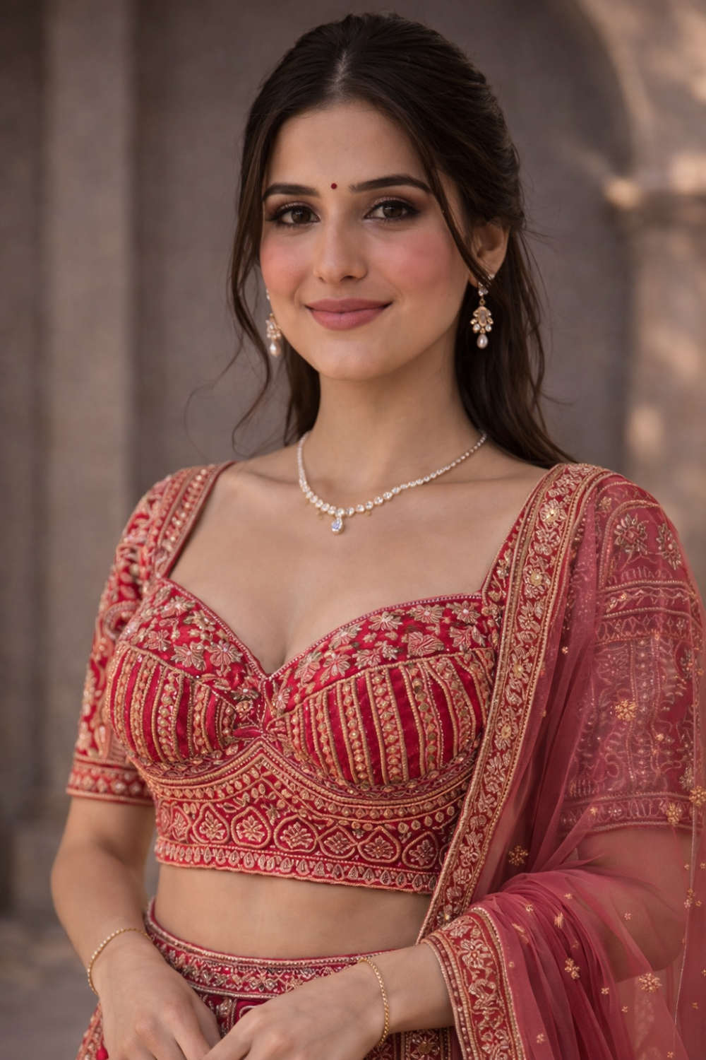 Rent this pink bridal lehenga with intricate zari embroidery and heritage motifs. Features sweetheart neckline blouse with back opening, lehenga has adjustable drawstring waist. Perfect for weddings, receptions.