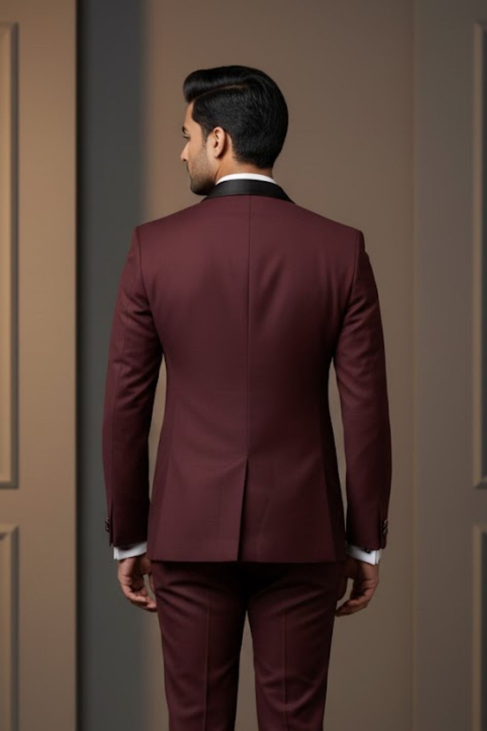 Rent this bold maroon tuxedo in a fine fabric, accented by a contrasting black satin shawl lapel and clean tailoring.