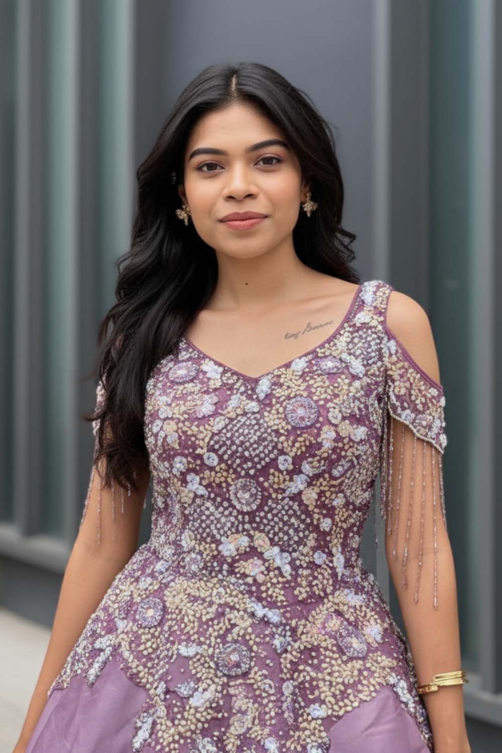 Rent this glamorous purple gown with a full, flowing satin skirt, a heavily embellished bodice featuring elegant bead fringe on the cold-shoulder straps, and multi-colored sequin work.