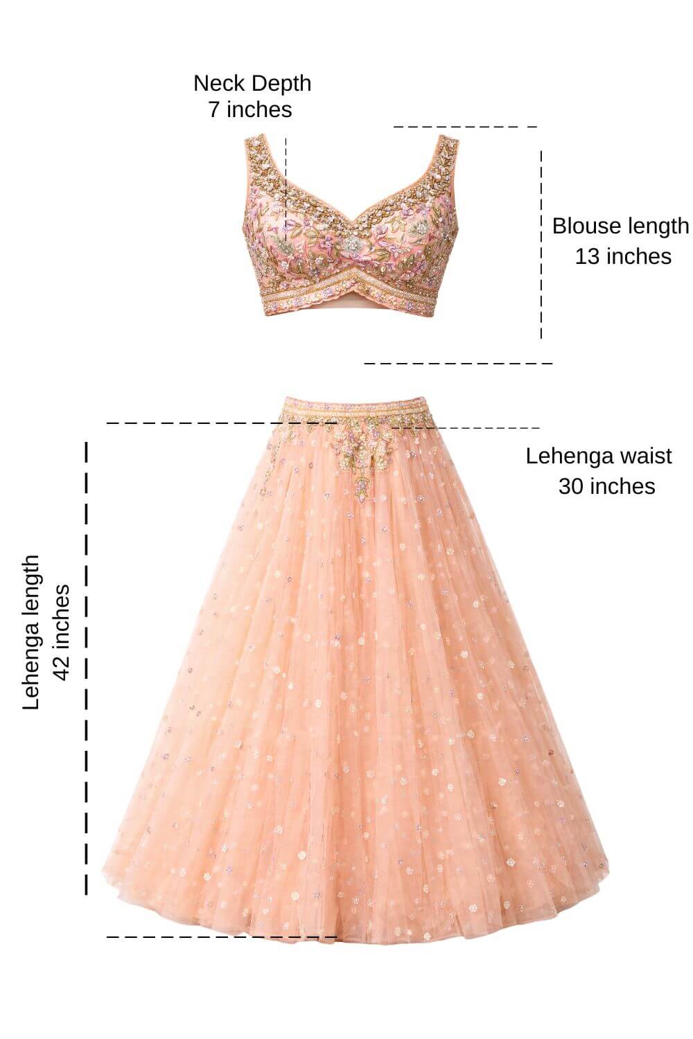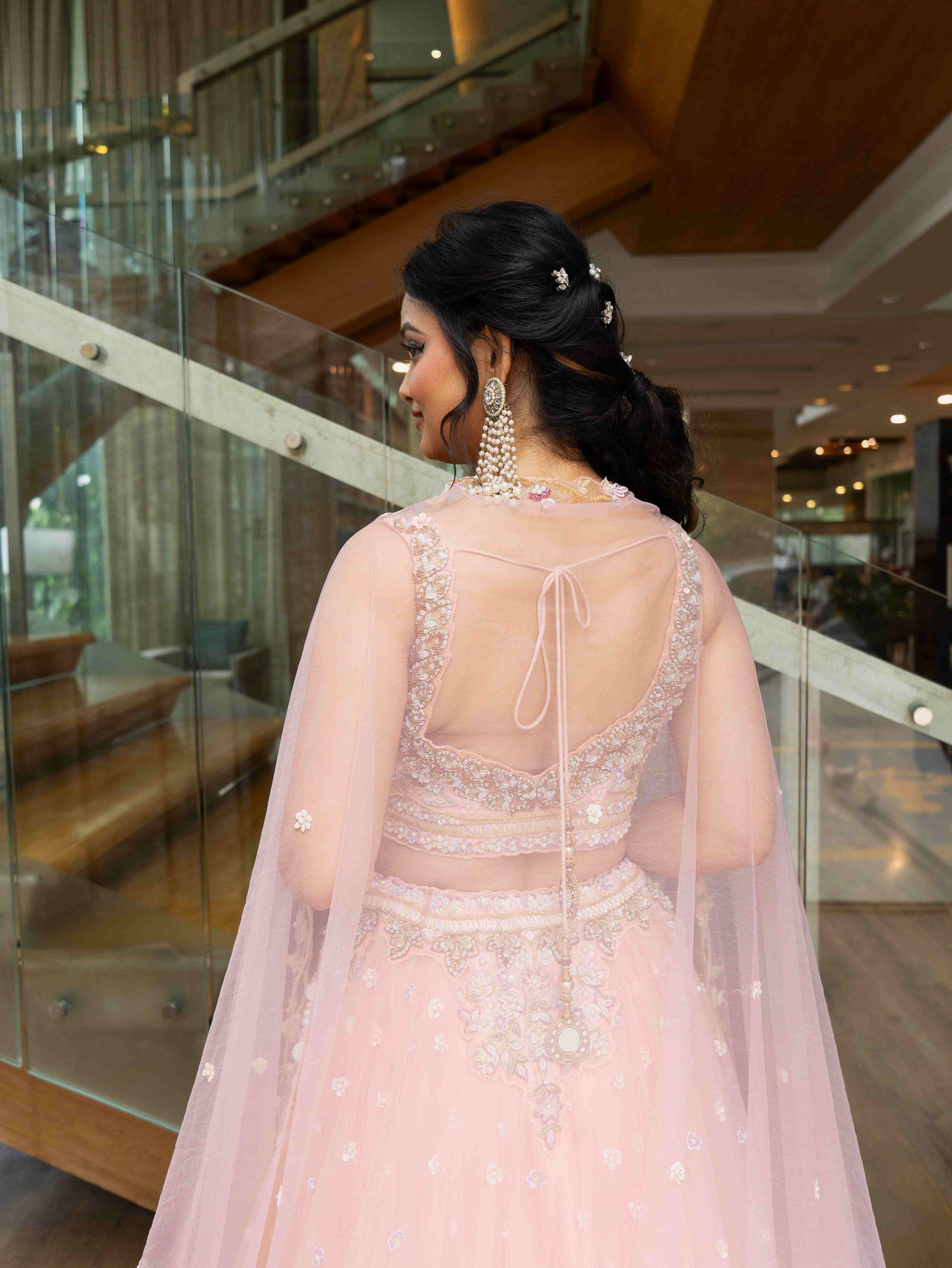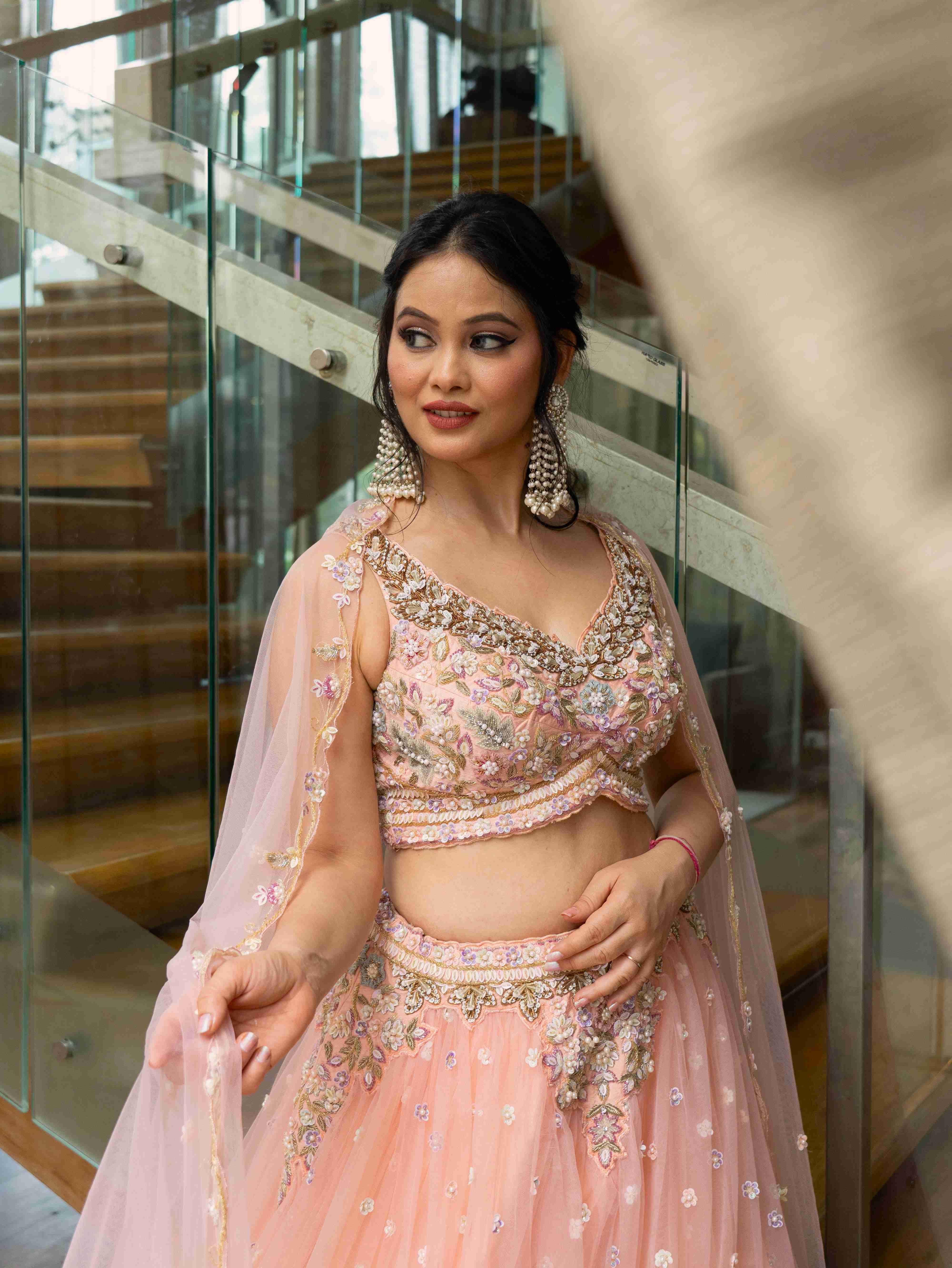 Rent this peach net lehenga adorned with delicate floral embroidery and subtle sequin accents. Blouse with side zip, adjustable drawstring waist, flowy dupatta, perfect for sangeet and carnival.