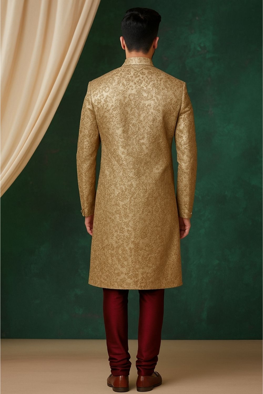 Rent this spectacular Gold sherwani, a show-stopping piece with rich embroidery ideal for a grand celebration.