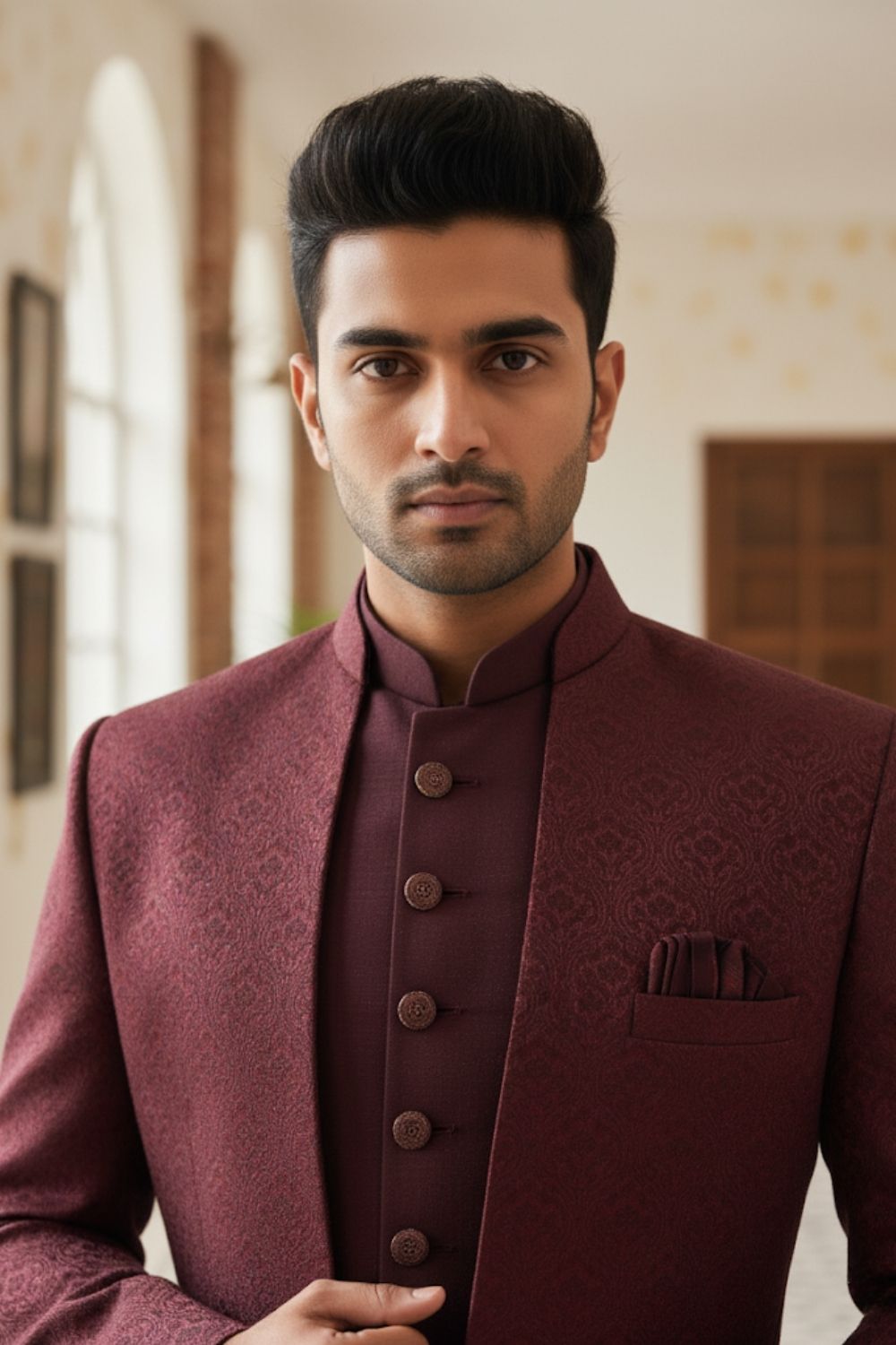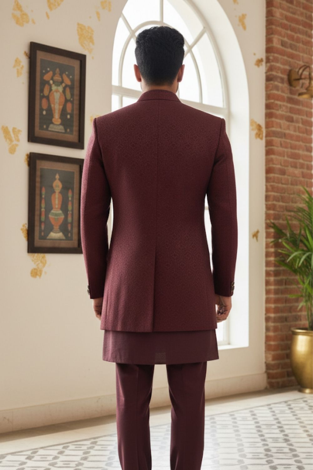 Rent this exquisite Maroon Indo-western with a open sherwani and kurti, a timeless piece with a unique woven pattern for a truly distinguished look.
