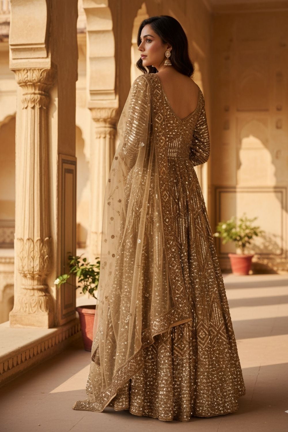 Rent this magnificent gold lehenga set crafted from net fabric, featuring heavy all-over sequin and bead work in a striking geometric pattern, complete with a matching fully-sequined blouse and a coordinated net dupatta.