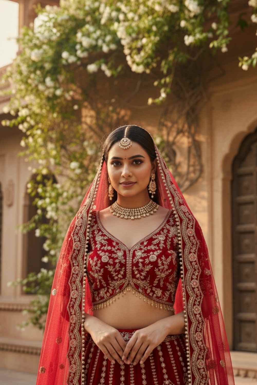 Rent this rich red velvet bridal lehenga featuring intricate Zardozi and zari work. The stunning ensemble includes a heavily embroidered lehenga, choli, and single dupatta.
