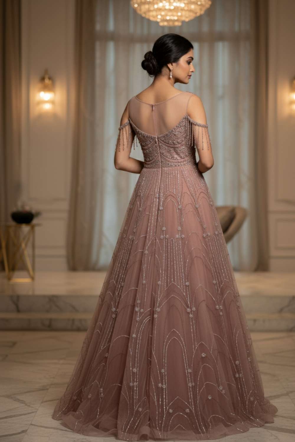 Rent this ethereal pink evening gown crafted from fine net fabric, adorned with a mix of silver, gold, and rose-gold beads and sequins on both the bodice and the skirt for a sparkling, sophisticated style.