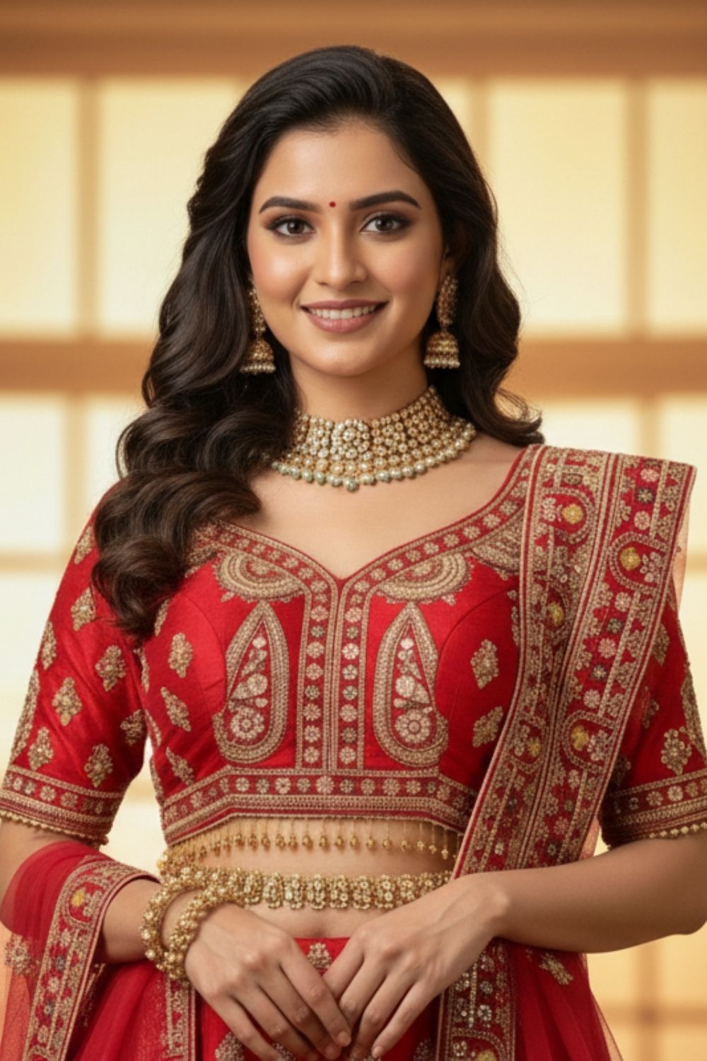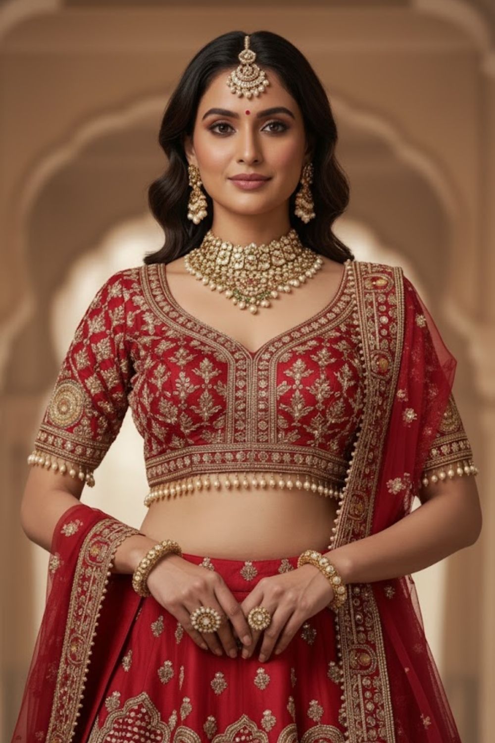 Red bridal lehenga styled with a blouse, belt and double dupatta