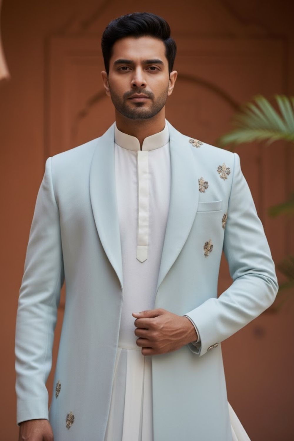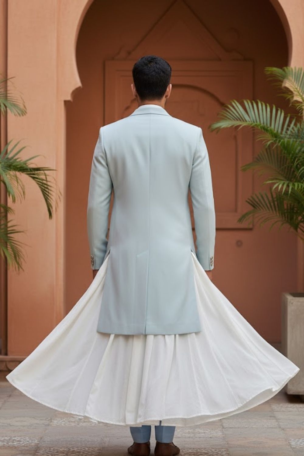 Rent this elegant light blue indo-western with long flared kurta, long jacket in a smooth suiting fabric, featuring minimal gold zari thread work motifs.