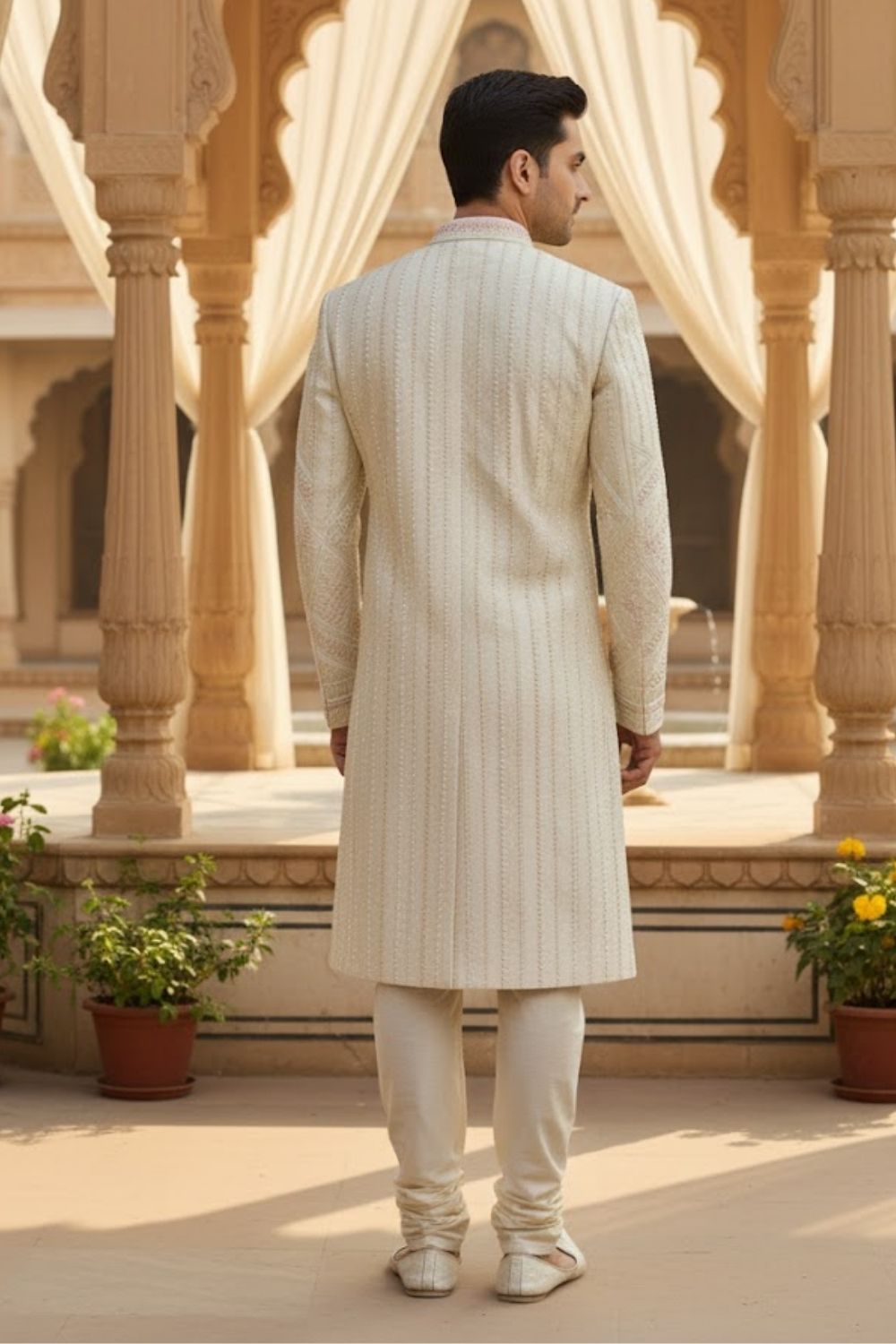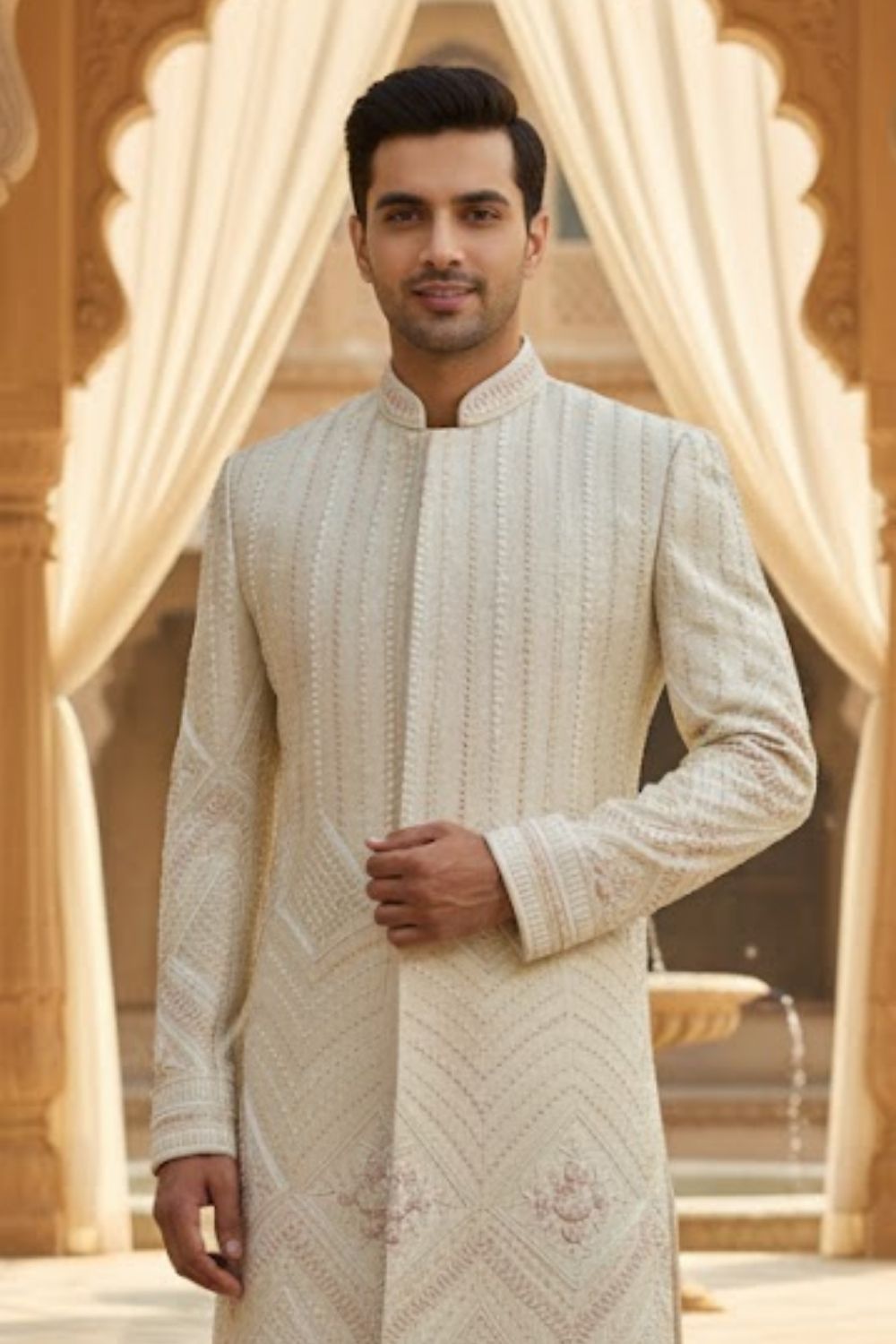 Rent this stunning beige sherwani made of rich fabric, showcasing detailed all-over geometric and striped thread embroidery.