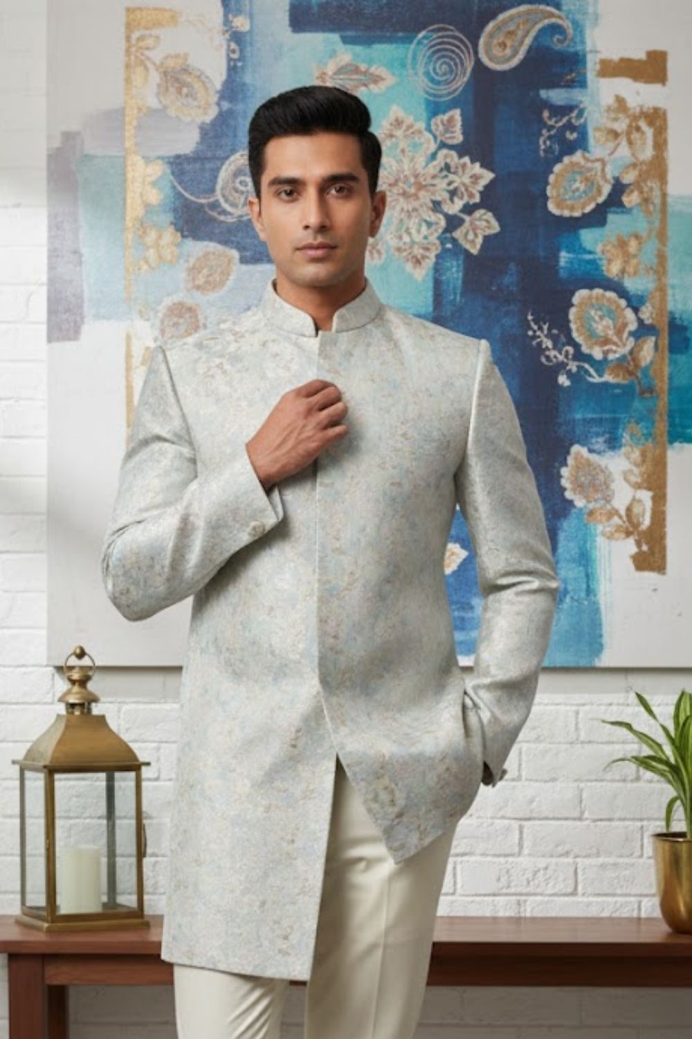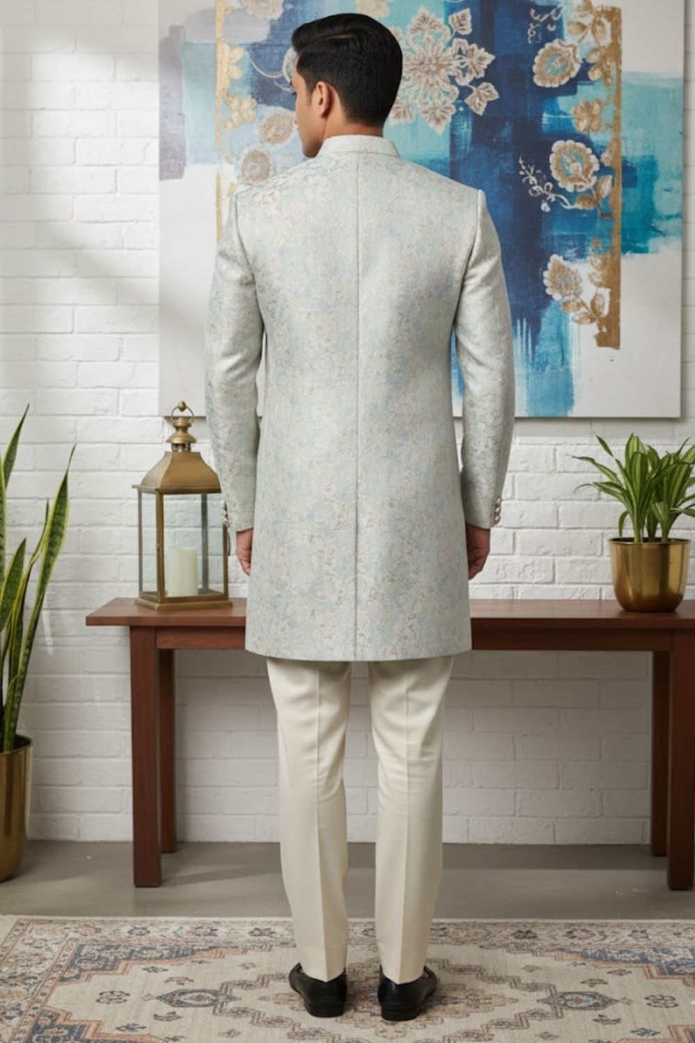 Rent this elegant greyish blue sherwani crafted on raw silk, featuring a subtle gold and silver floral pattern for a shimmering effect.