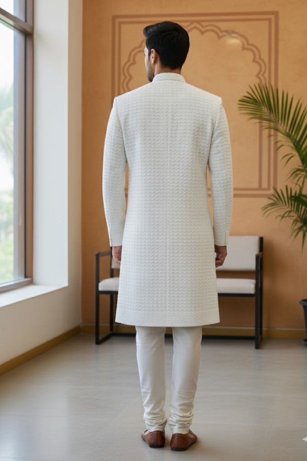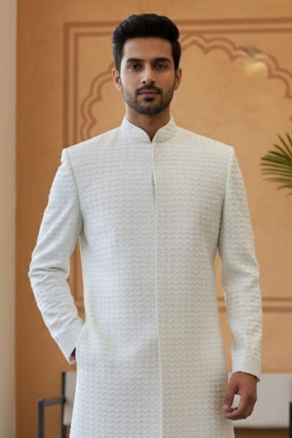 Rent this striking white sherwani, made from a structured fabric and featuring dense, symmetric beadwork for a modern texture.