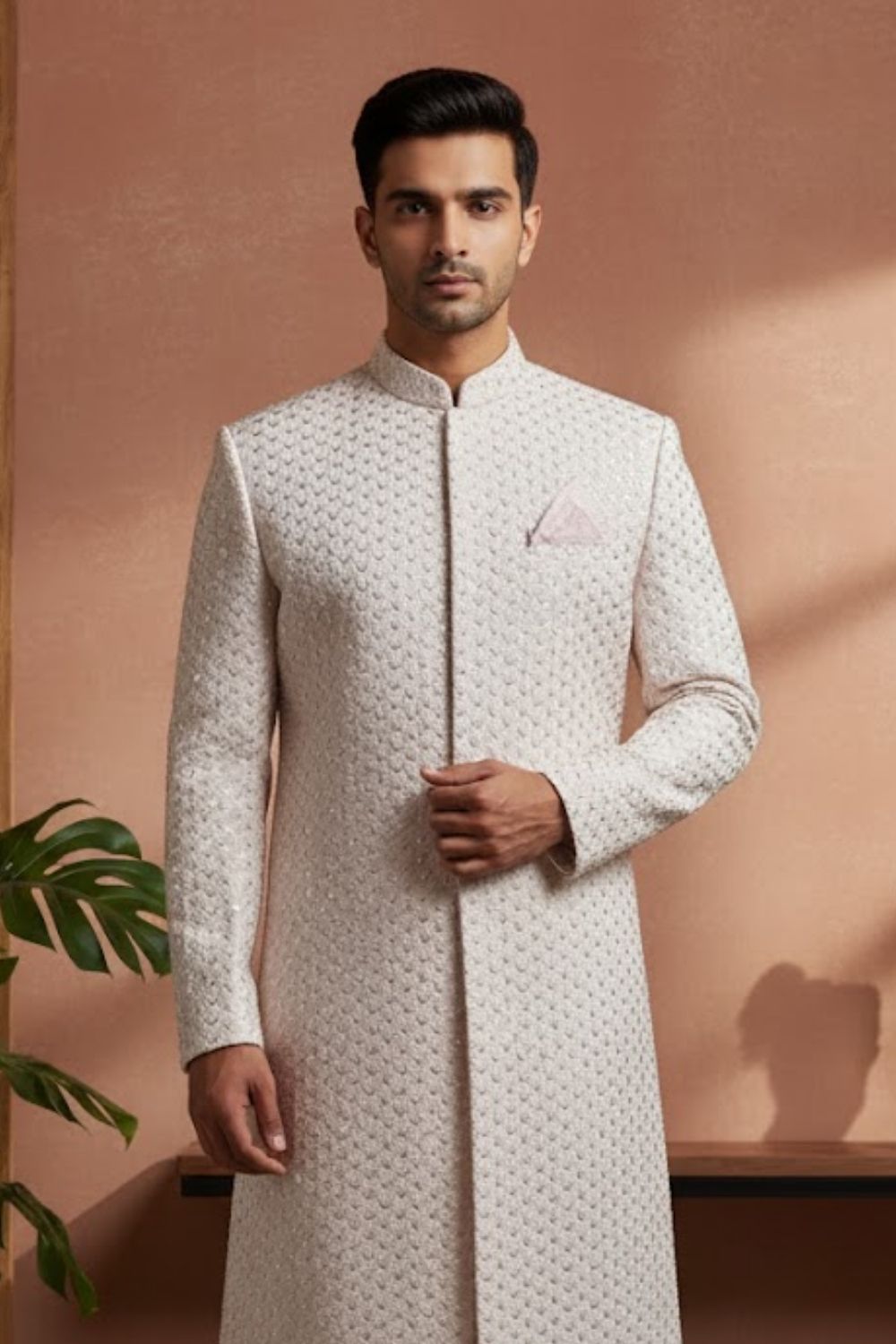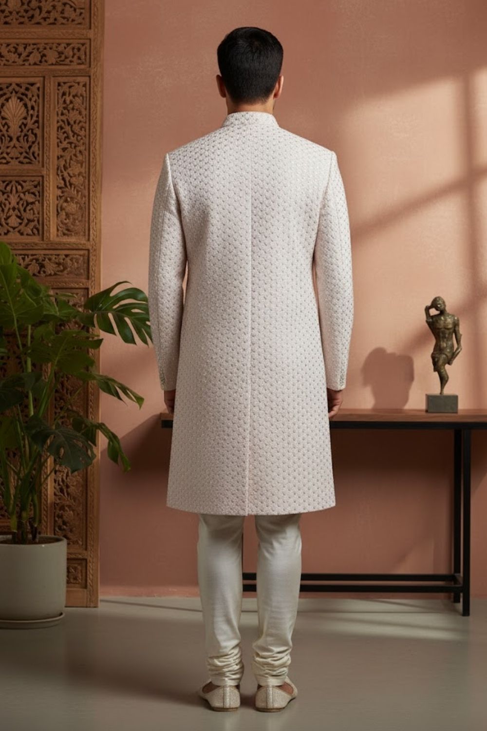 Rent this opulent blush pink sherwani, crafted from textured fabric with threadwork and subtle bead and sequin embellishment.