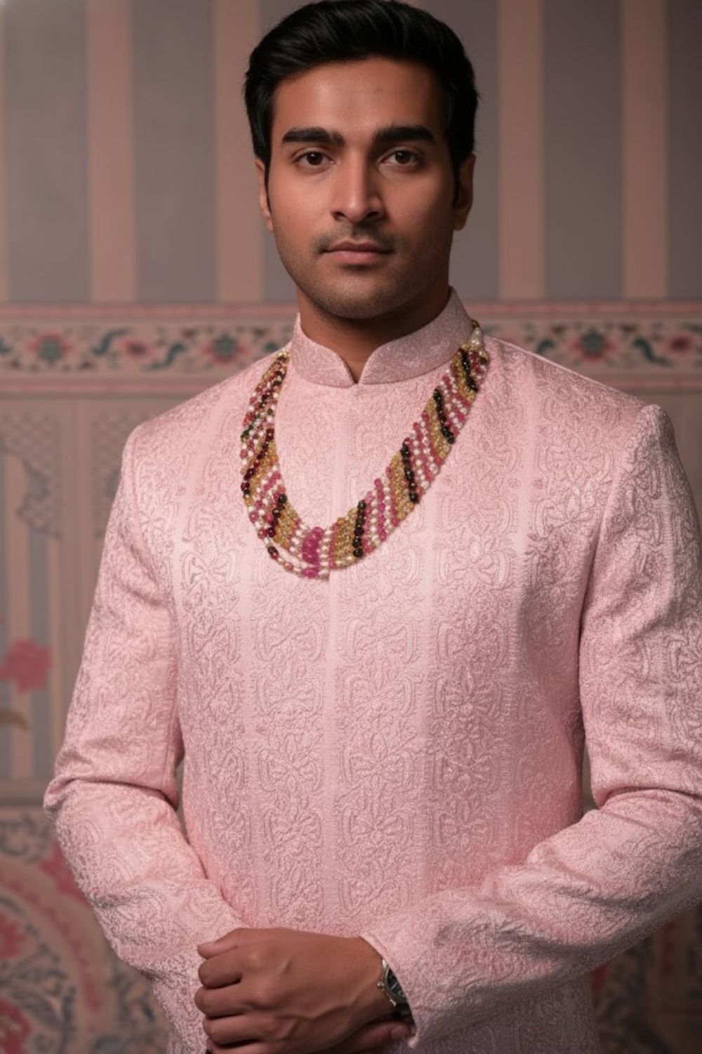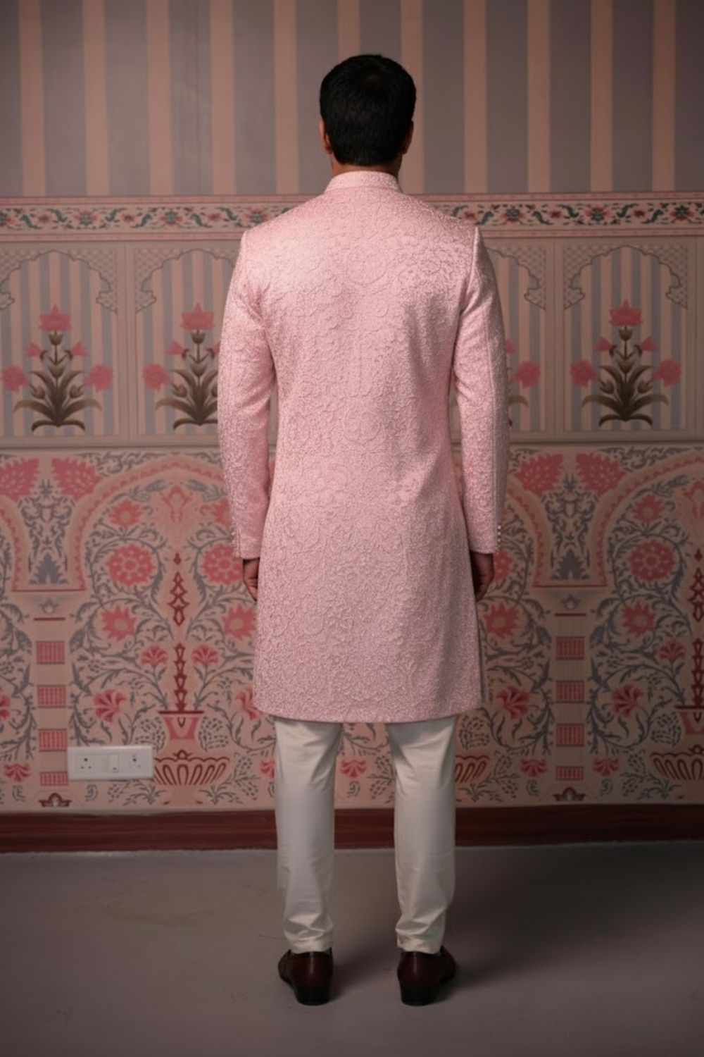 Rent this charming pastel pink sherwani beautifully adorned with delicate thread work, to achieve a graceful and elegant look for your next formal occasion.