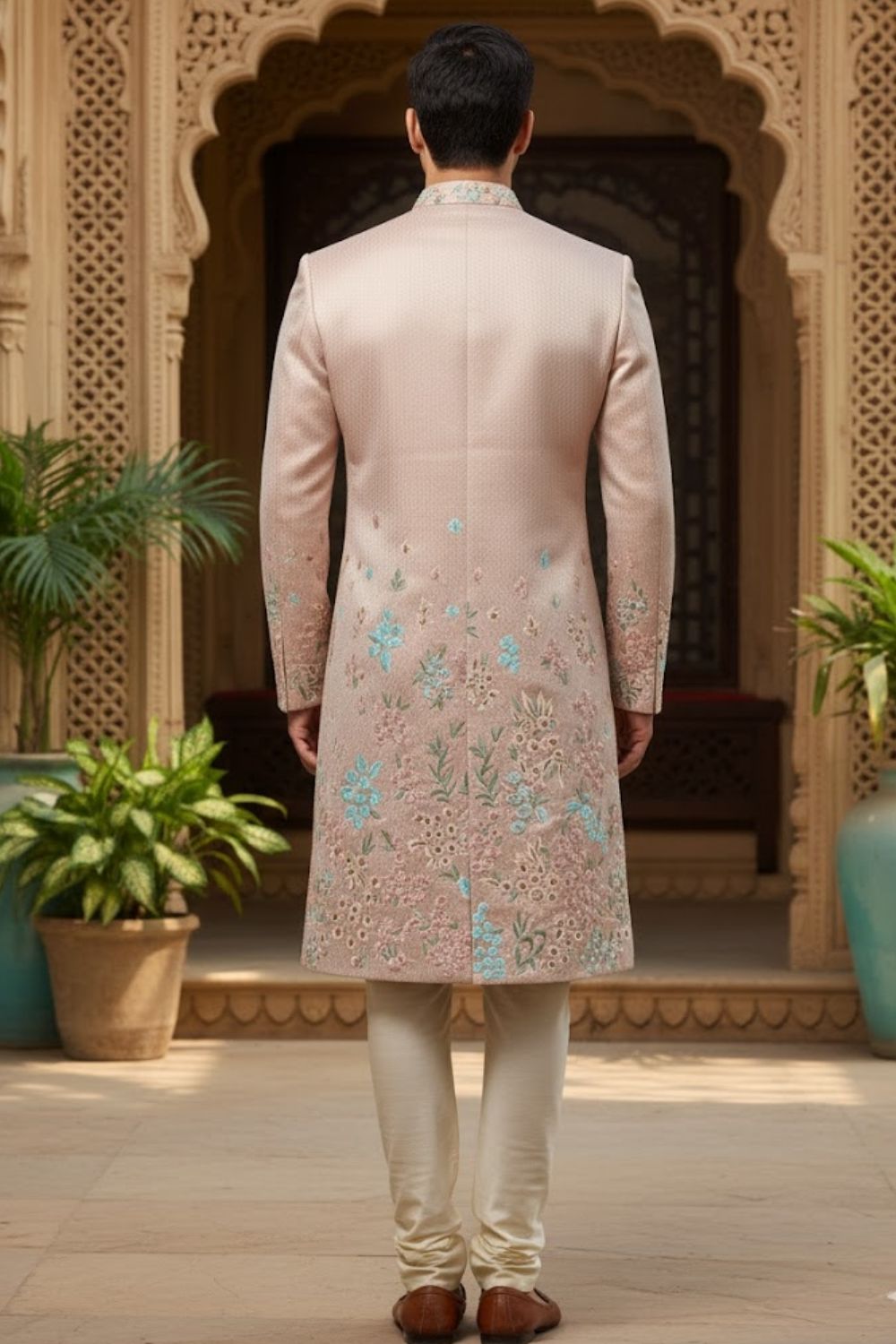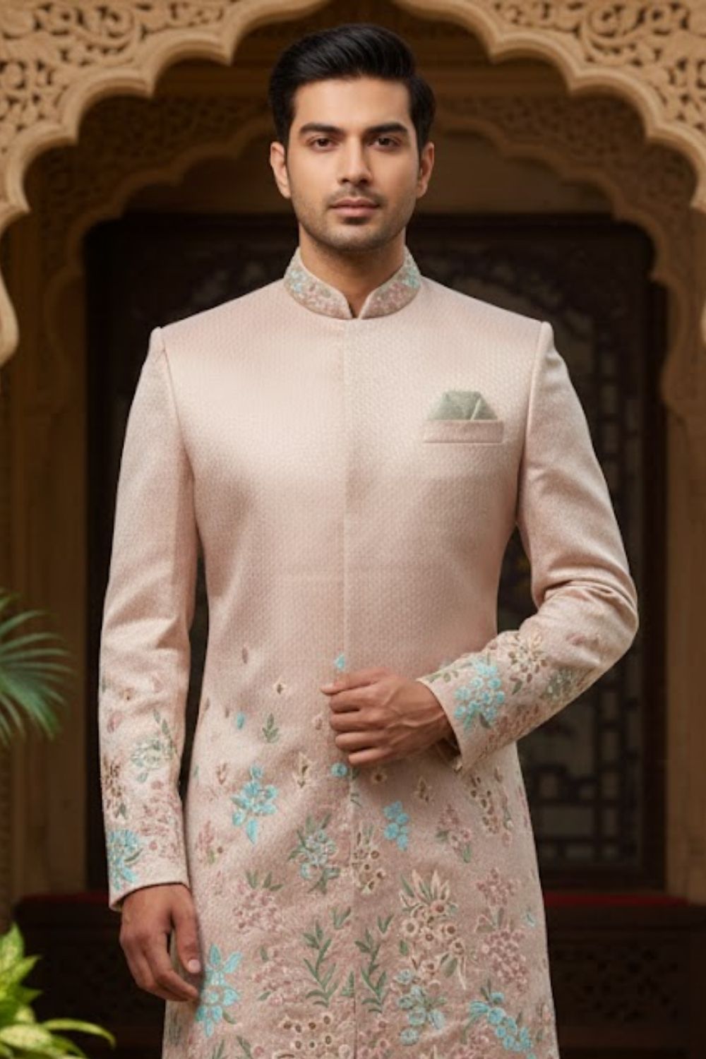 Rent this romantic blush pink sherwani, featuring beautiful multicolor floral thread embroidery along the hemline and cuffs.