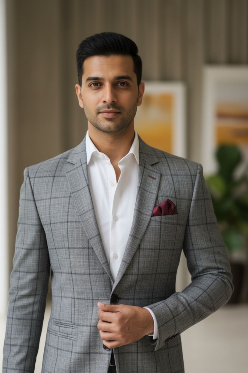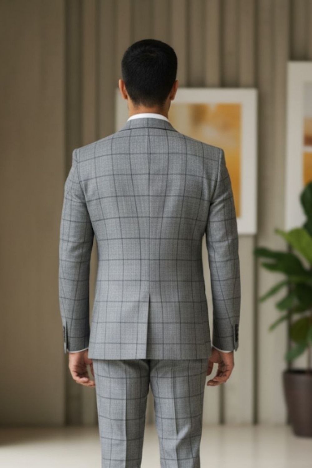 Rent this sharp grey blazer, with black checks and white micro-check fabric, with multiple pockets.