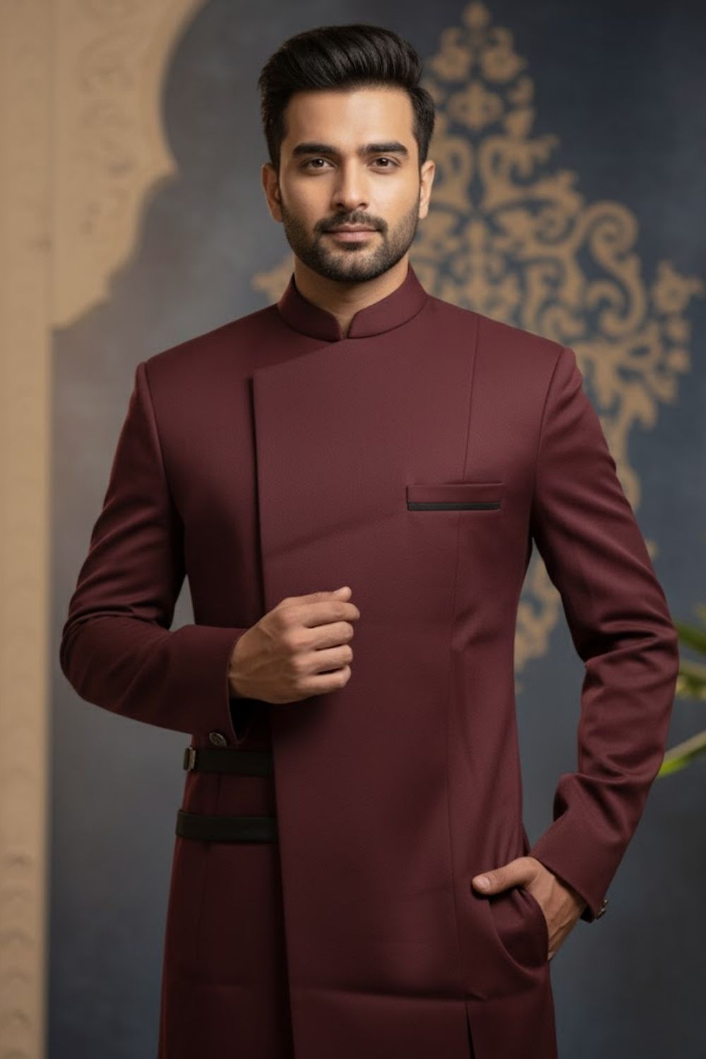 Rent this bold maroon indo-western in a smooth suiting fabric, featuring a modern asymmetrical cut with black strap detailing on the side.