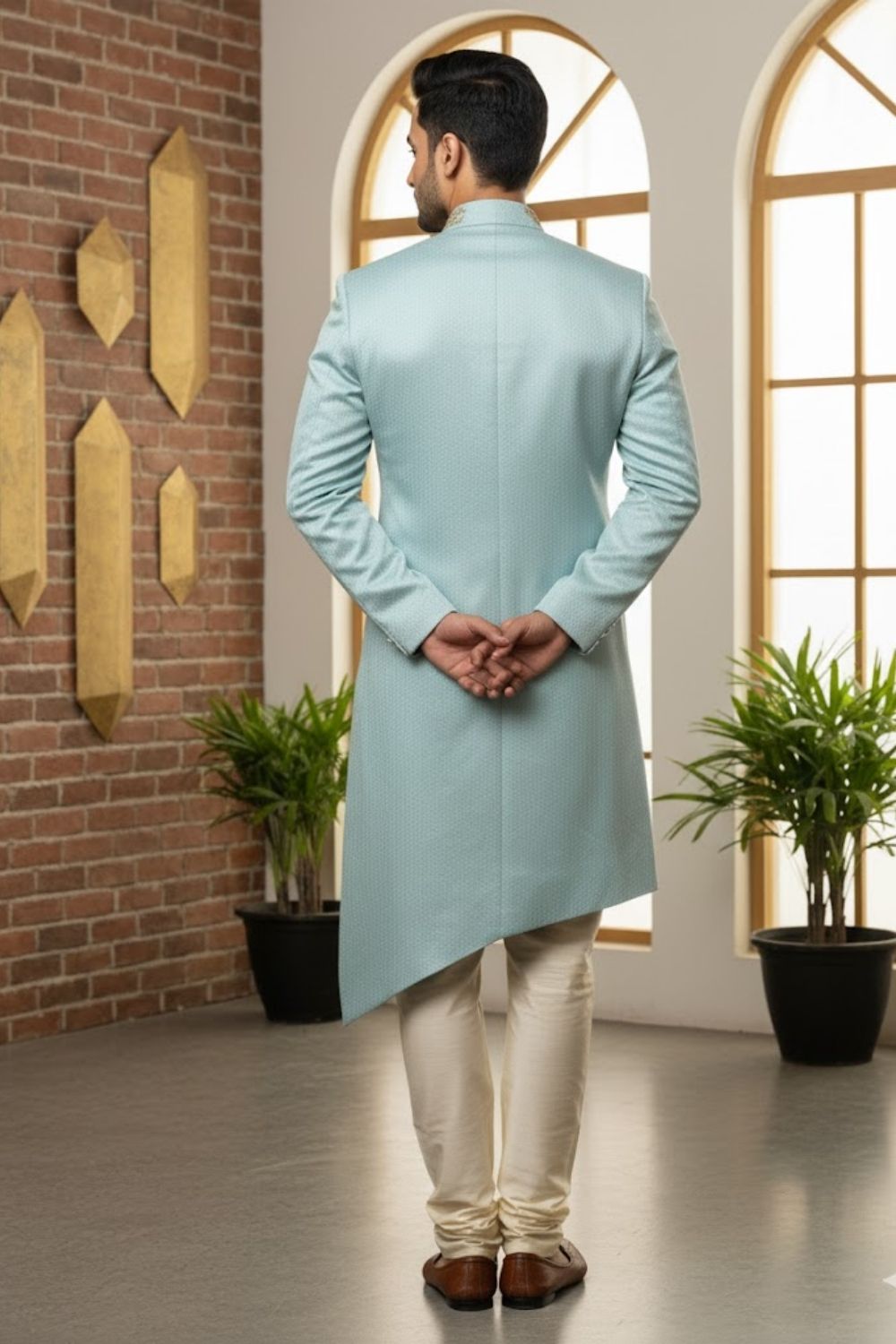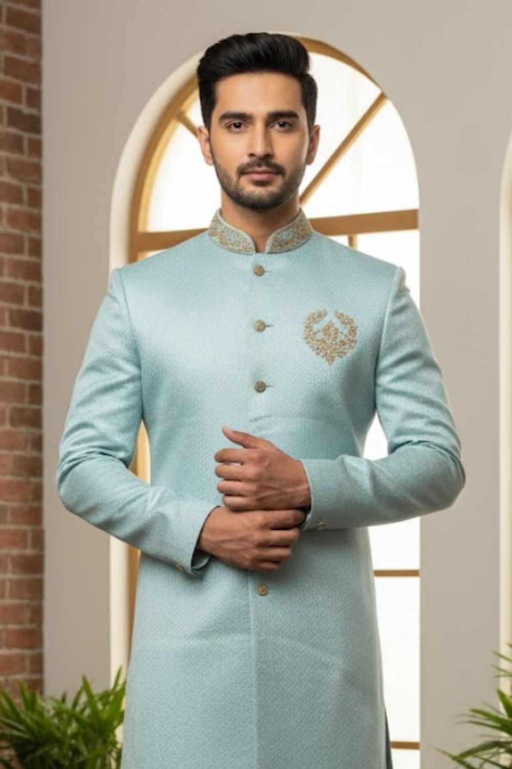 Rent this sophisticated blue indo-western sherwani, featuring exquisite gold thread and zari embroidery detail on the collar and chest.