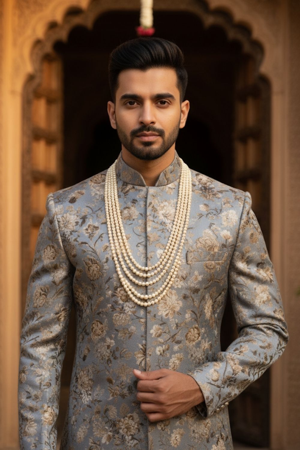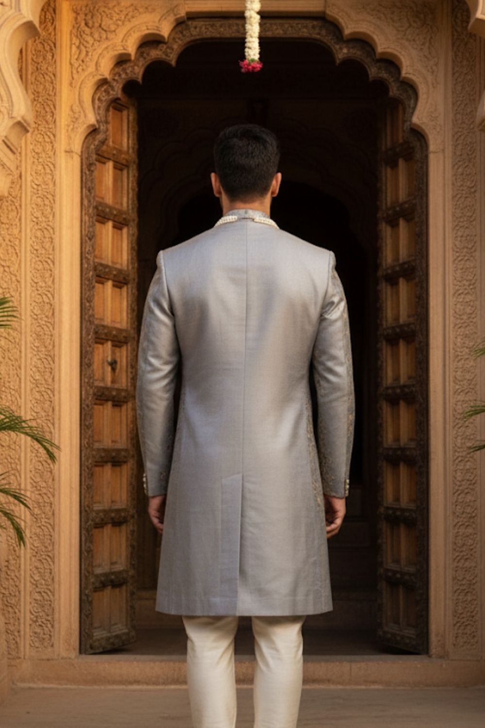 Rent this regal Lavender textured sherwani, intricately patterned with gold accents and embroidered collar, perfect for a grand celebration.