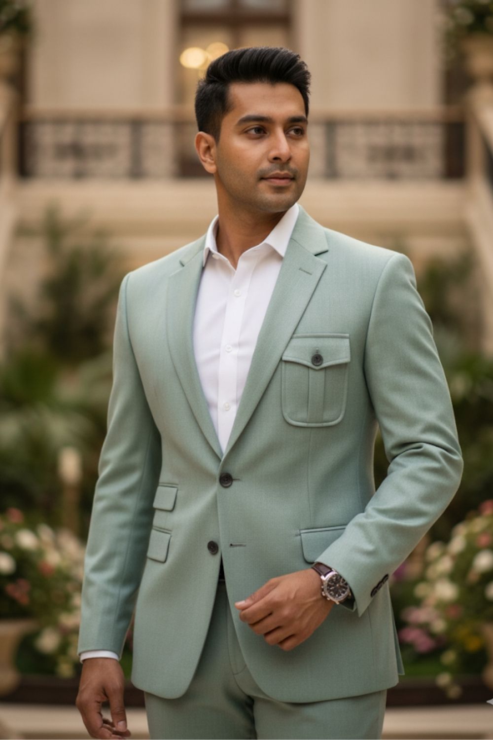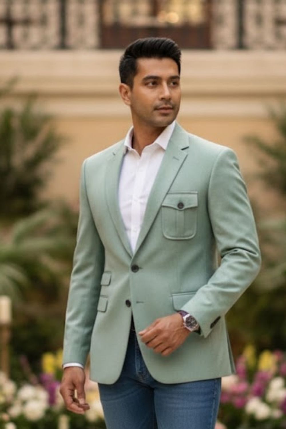Rent this distinctive olive green blazer, consisting of flap pockets and a modern silhouette.