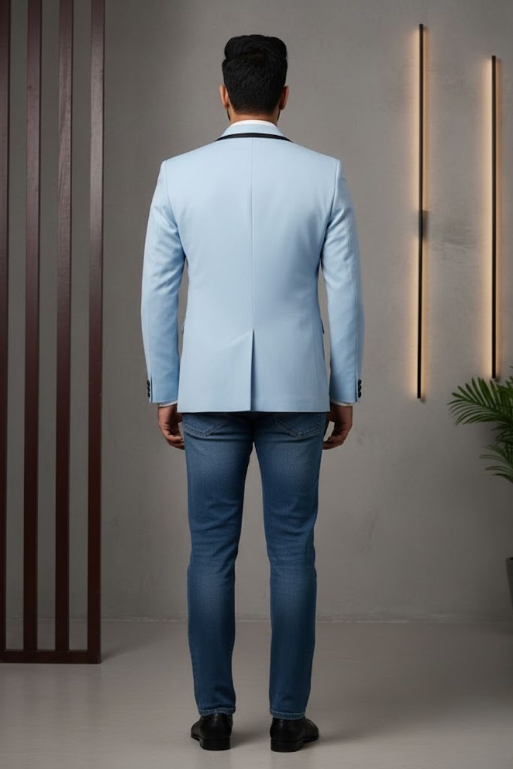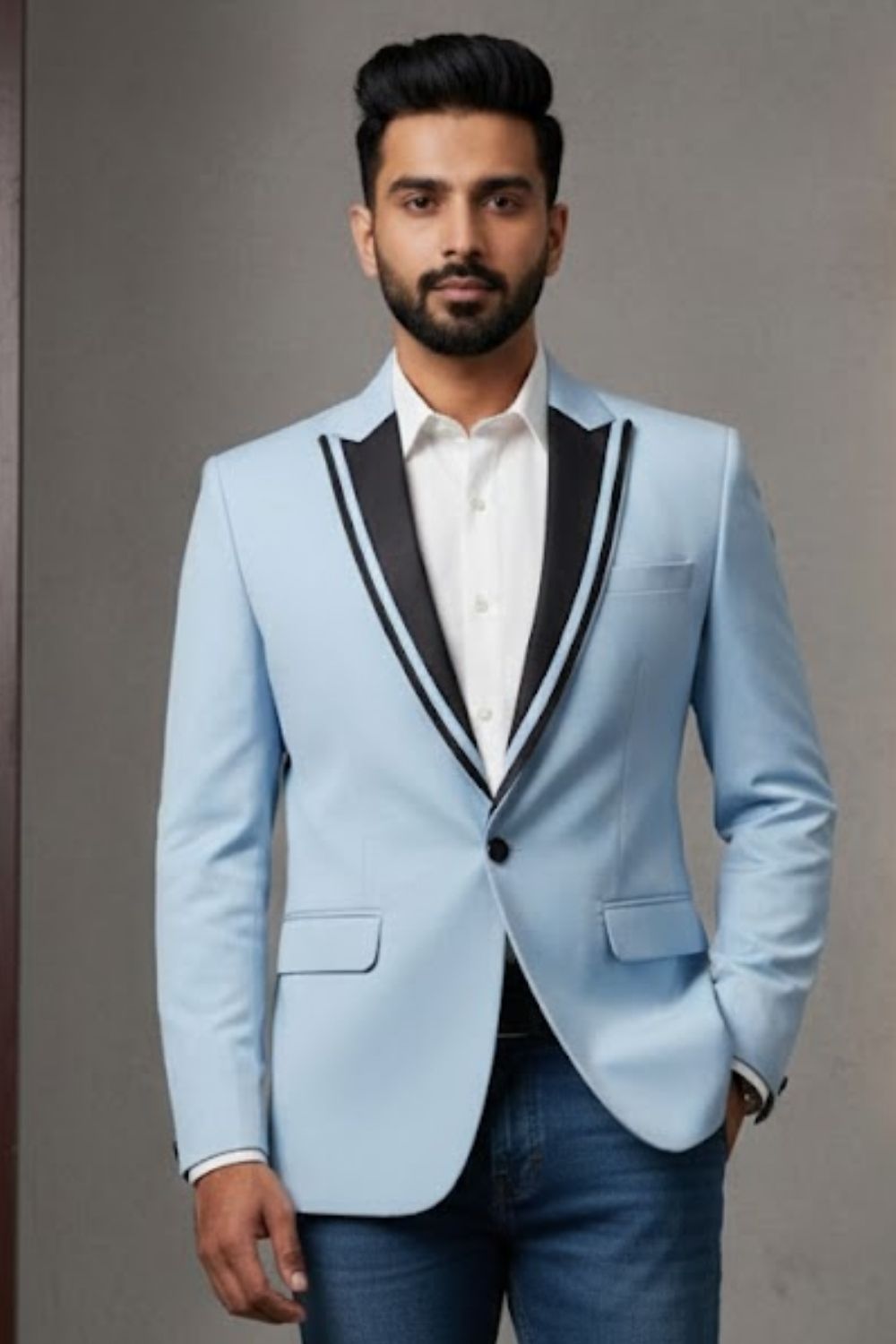 Rent this striking powder blue blazer in smooth suiting fabric, featuring a dramatic black satin shawl lapel with white piping for a standout party or reception look.