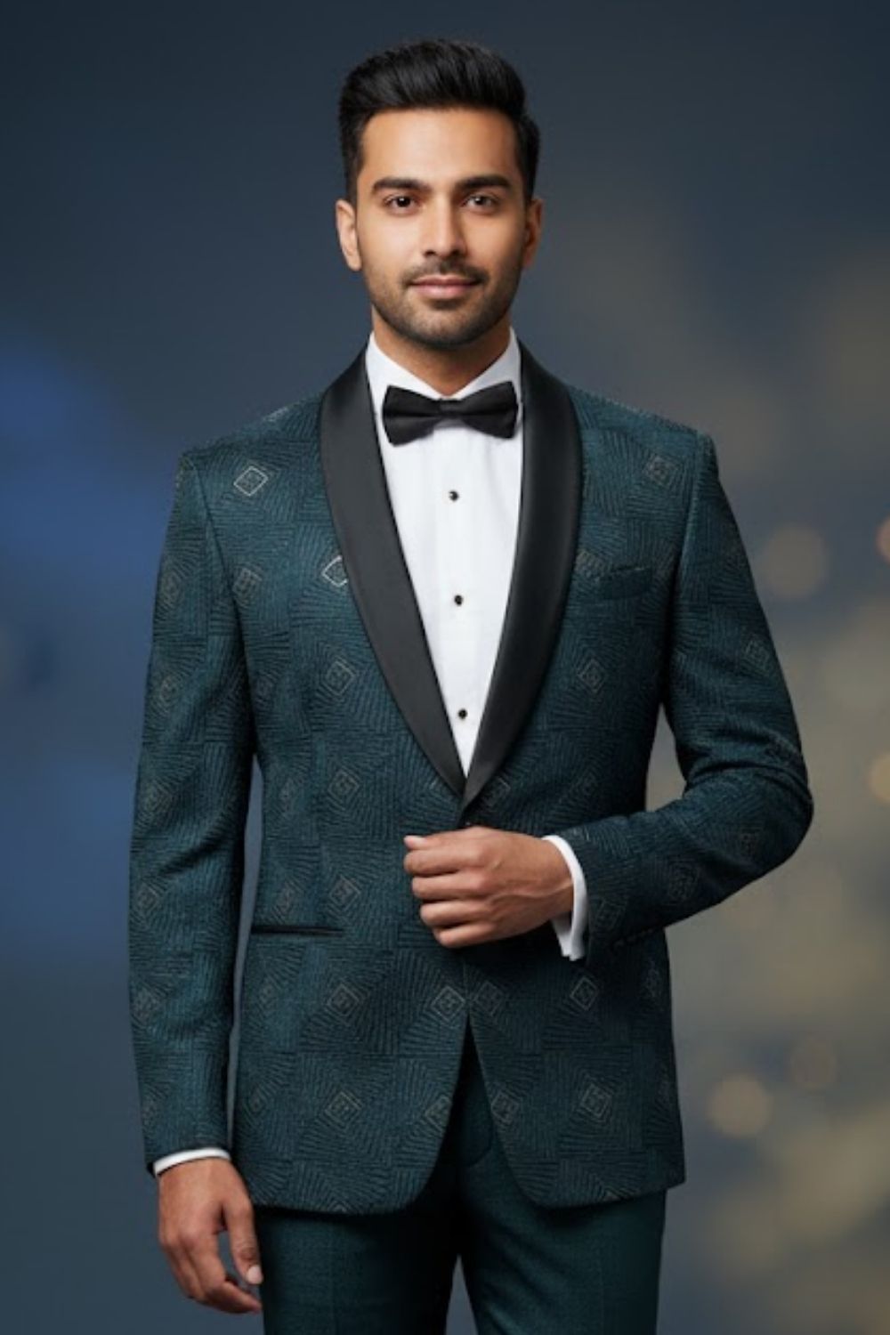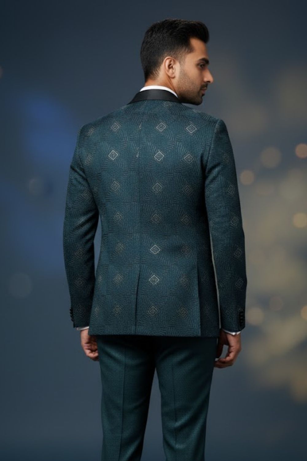 Rent this sophisticated blue party tuxedo, featuring a textured geometric brocade with silver sequin bead work details and a contrasting satin shawl lapel.